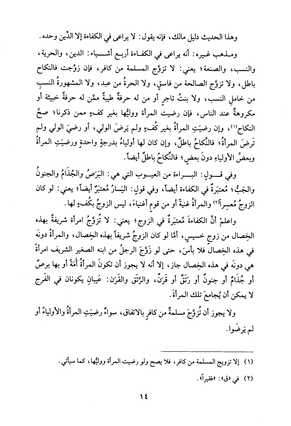 ومذهب غيره: أنه يراعى في الكفاءة أربع أشياء: الدين، والحرية، والنسب، والصنعة؛ يعني: لا تزوَّج المسلمة من كافر، فإن زوِّجت فالنكاح باطل، ولا تزوَّج الصالحة من فاسقٍ، ولا الحرةُ من عبد، ولا المشهورةُ النسبِ من خاملِ النسب، ولا بنتُ تاجرٍ أو من له حرفةٌ طيبةٌ ممَّن له حرفةٌ خبيثة أو مكروهةٌ عند الناس، فإن رضيت المرأة ووليُّها بغير كفءٍ ممن ذكرنا؛ صحَّ النكاح (¬1)، وإن رضيَتِ المرأةُ بغير كُفءٍ ولم يَرضَ الولي، أو رضيَ الولي ولم تَرضَ المرأةُ؛ فالنَّكاحُ باطلٌ، وإن كان لها أولياءُ بدرجةٍ واحدةٍ ورضيَتِ المرأةُ وبعضُ الأولياءِ دونَ بعضٍ؛ فالنَّكاحُ باطلٌ أيضًا.