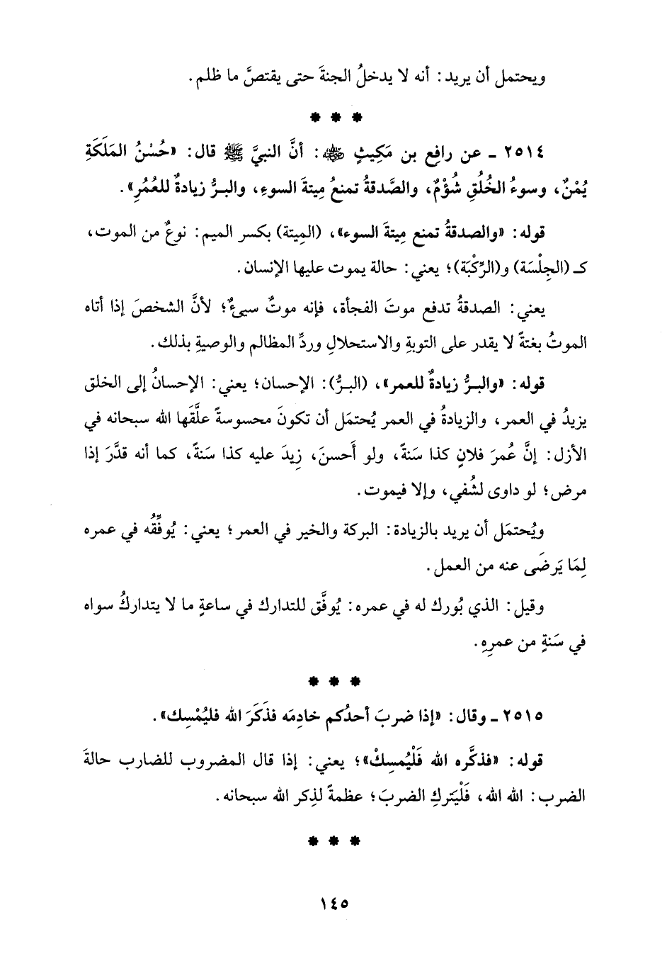 2514 - عن رافِع بن مَكِيثٍ - رضي الله عنه -: أنَّ النبيَّ - صلى الله عليه وسلم - قال: "حُسْنُ المَلَكَةِ يُمْنٌ، وسوءُ الخُلُقِ شُؤْمٌ، والصَّدقةُ تمنعُ مِيتةَ السوءِ، والبرُّ زيادةٌ للعُمُرِ".