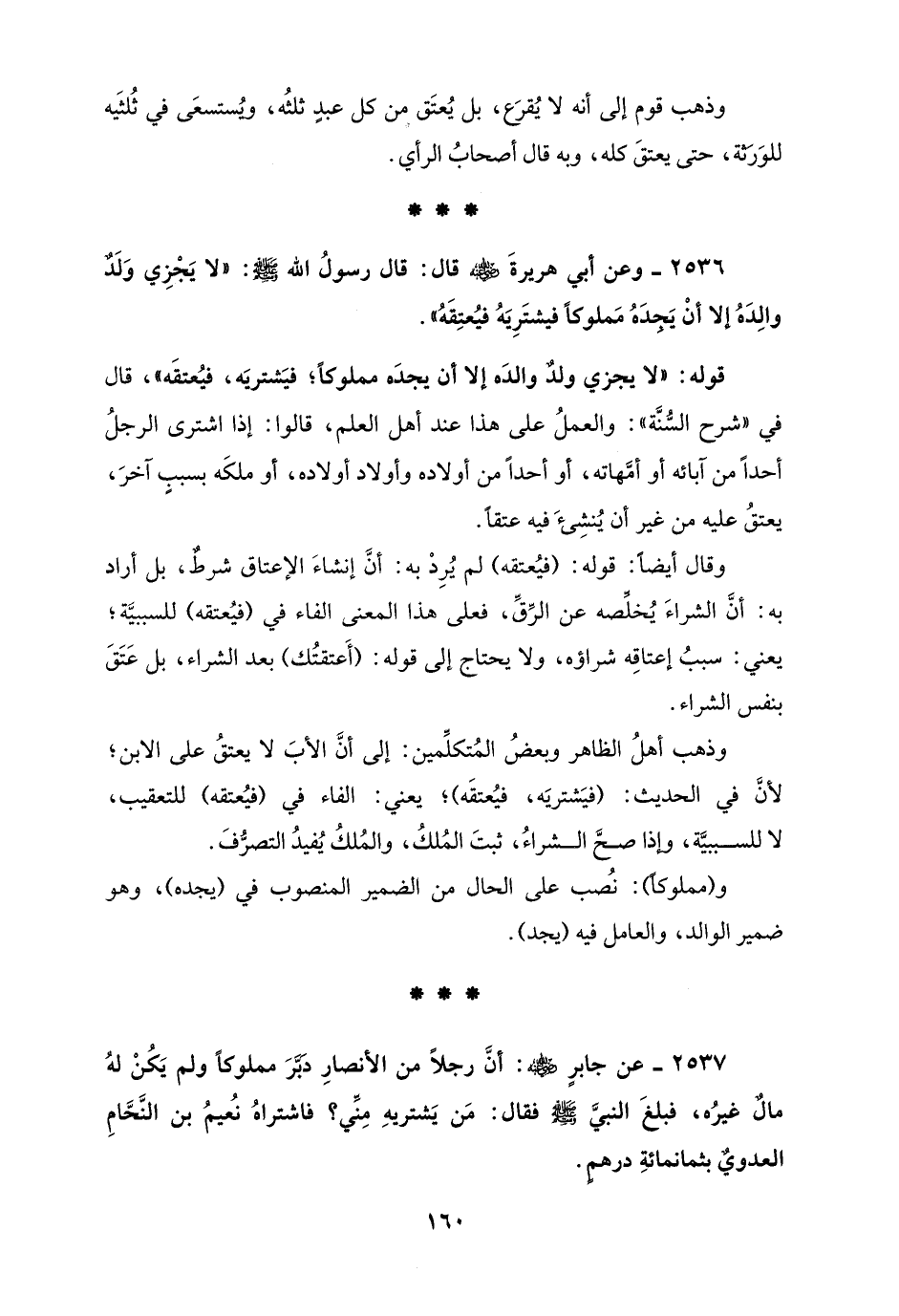 2536 - وعن أبي هريرةَ - رضي الله عنه - قال: قال رسولُ الله - صلى الله عليه وسلم -: "لا يَجْزِي وَلَدٌ والِدَهُ إلا أنْ يَجِدَهُ مَملوكًا فيشتَرِيَهُ فيُعتِقَهُ".