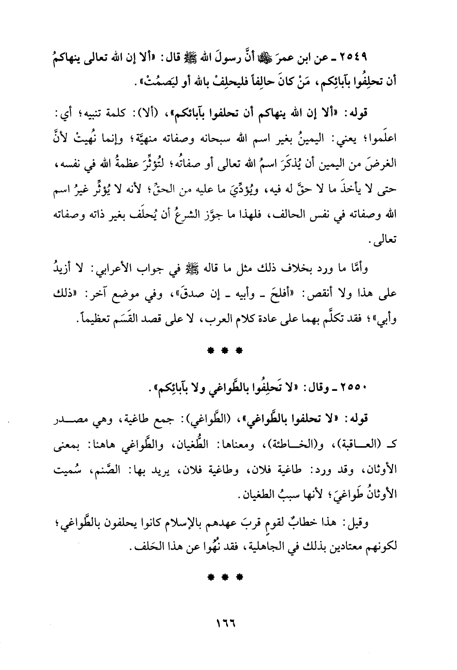 2549 - عن ابن عمرَ - رضي الله عنهما - أنَّ رسولَ الله - صلى الله عليه وسلم - قال: "ألا إن الله تعالى ينهاكمُ أن تحلِفُوا بآبائِكم، مَنْ كانَ حالِفًا فليحلِفْ بالله أو ليَصمُتْ".