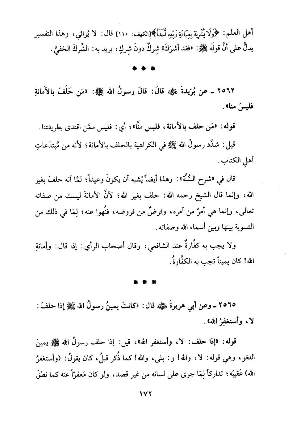 2562 - عن بُرَيدةَ - رضي الله عنه - قالَ: قالَ رسولُ الله - صلى الله عليه وسلم -: "مَن حَلَفَ بالأَمانةِ فليسَ منا".