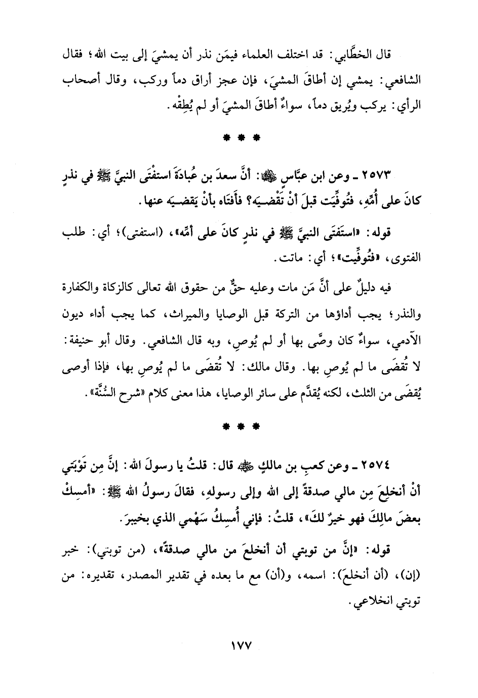 2574 - وعن كعبِ بن مالكٍ - رضي الله عنه - قال: قلتُ يا رسولَ الله: إنَّ مِن تَوْبَتي أنْ أنخلِعَ مِن مالي صدقةً إلى الله وإلى رسولهِ، فقالَ رسولُ الله - صلى الله عليه وسلم -: "أمسِكْ بعضَ مالِكَ فهو خيرٌ لكَ"، قلتُ: فإني أُمسِكُ سَهْمي الذي بخيبرَ.