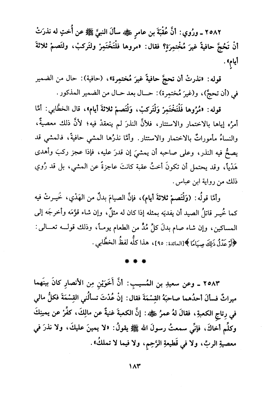 2582 - ورُوي: أن عُقْبَةَ بن عامرٍ - رضي الله عنه - سألَ النبيَّ - صلى الله عليه وسلم - عن أُختٍ له نذرَتْ أنْ تَحُجَّ حافيةً غيرَ مُختمِرَةٍ؟ فقال: "مروها فلْتَخْتَمِرْ ولتَركبْ، ولتَصمْ ثلاثةَ أيامٍ".