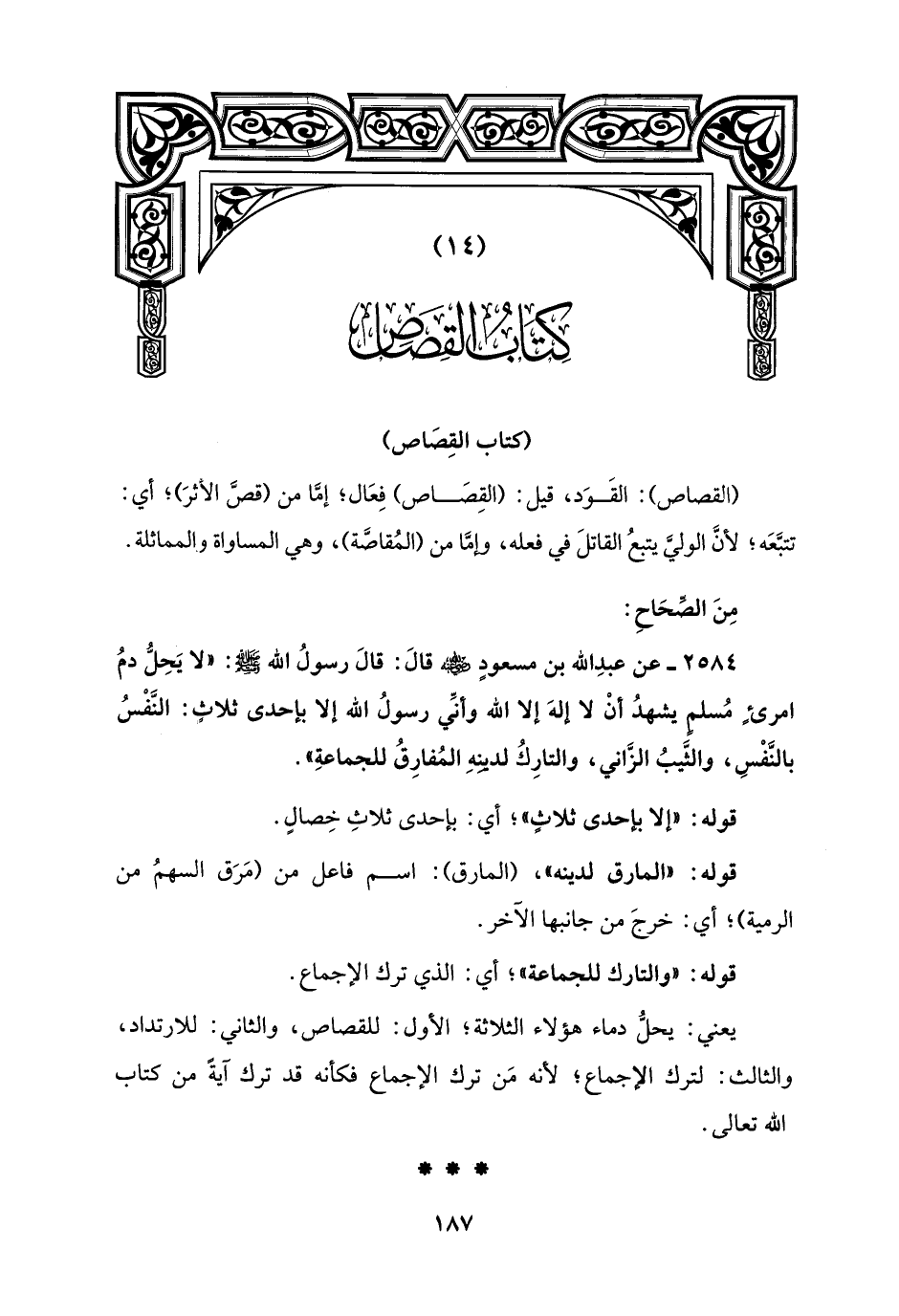 2584 - عن عبدِ الله بن مسعودٍ - رضي الله عنه - قالَ: قالَ رسولُ الله - صلى الله عليه وسلم -: "لا يَحِلُّ دمُ امرئٍ مُسلمٍ يشهدُ أنْ لا إلهَ إلا الله وأنَّي رسولُ الله إلا بإحدى ثلاثٍ: النَّفْسُ بالنَّفْسِ، والثَّيبُ الزَّاني، والتارِكُ لدينِهِ المُفارِقُ للجماعةِ".