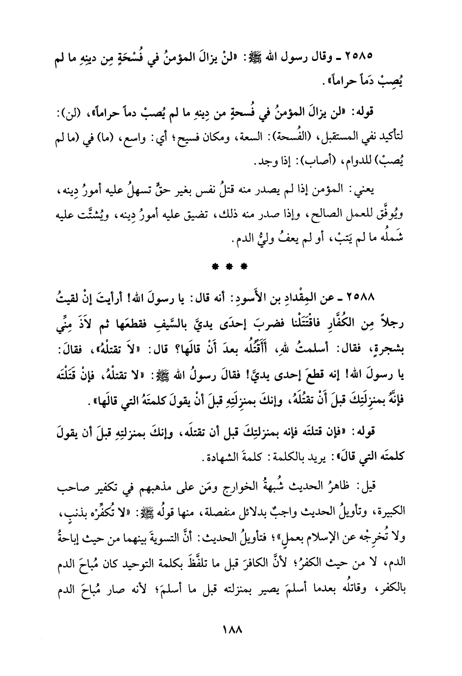 2588 - عن المِقْدادِ بن الأَسودِ: أنه قال: يا رسولَ الله! أرأيتَ إنْ لقيتُ رجلاً مِن الكُفَّارِ فاقْتَتَلْنا فضربَ إحدَى يديَّ بالسَّيفِ فقطعَها ثم لاَذَ مِنِّي بشجرةٍ، فقال: أسلمتُ للهِ، أَأَقْتُلُه بعدَ أَنْ قالَها؟ قال: "لاَ تقتلْهُ"، فقالَ: يا رسولَ الله! إنه قطعَ إحدى يديَّ! فقالَ رسولُ الله - صلى الله عليه وسلم -: "لا تقتلْهُ، فإنْ قَتَلْتَه فإنَّهُ بمنزِلَتِكَ قبلَ أَنْ تقتُلَهُ، وإنكَ بمنزِلَتِهِ قبلَ أنْ يقولَ كلمتَهُ التي قالَها".