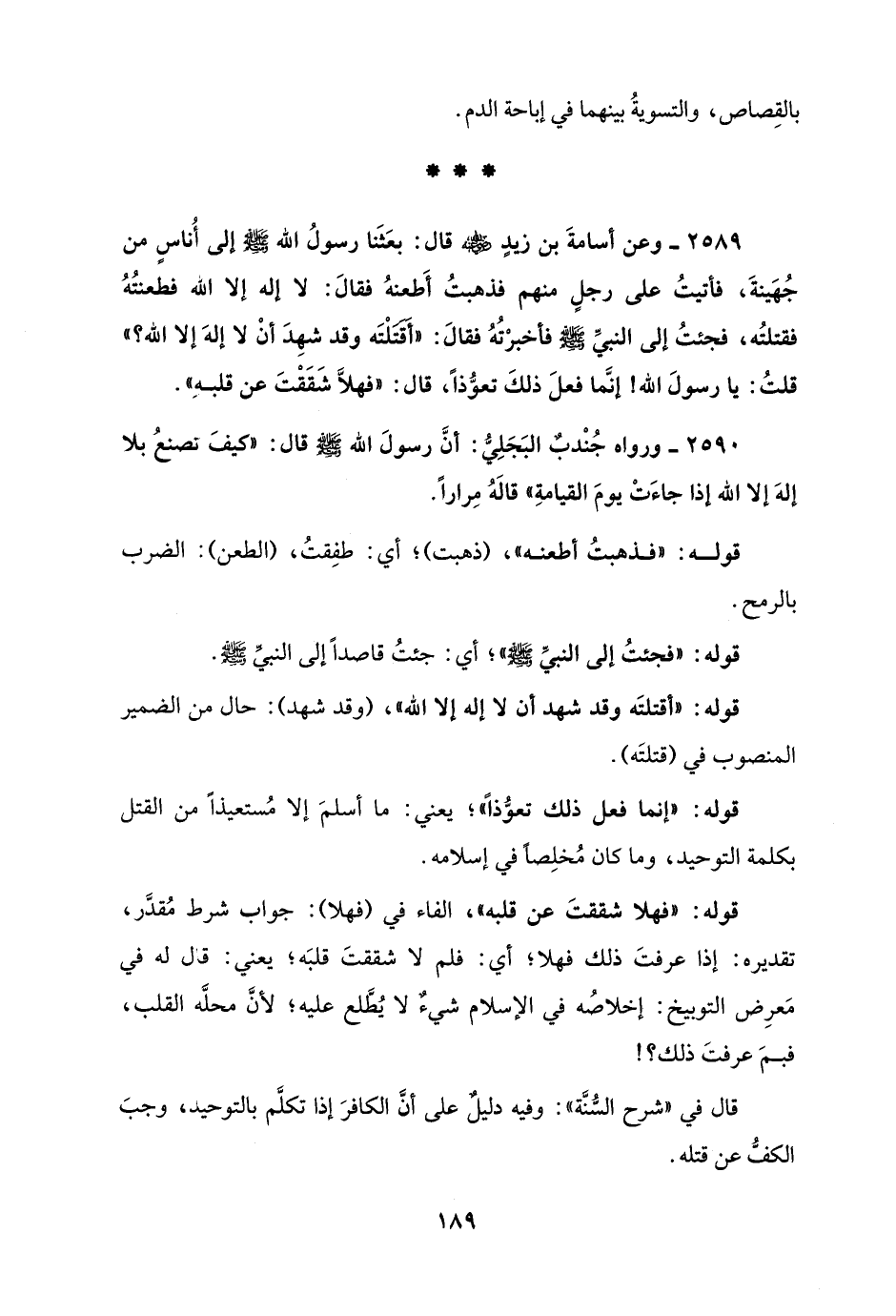 2589 - وعن أسامةَ بن زيدٍ - رضي الله عنه - قال: بعَثَنا رسولُ الله - صلى الله عليه وسلم - إلى أُناسٍ من جُهَينةَ، فأتيتُ على رجلٍ منهم فذهبتُ أَطعنهُ فقالَ: لا إله إلا الله فطعنتُهُ فقتلتُه، فجئتُ إلى النبيِّ - صلى الله عليه وسلم - فأخبرتُهُ فقالَ: "أَقَتَلْتَه وقد شهِدَ أنْ لا إلهَ إلا الله؟ " قلتُ: يا رسولَ الله! إنَّما فعلَ ذلكَ تعوُّذًا، قال: "فهلَّا شَقَقْتَ عن قلبهِ".