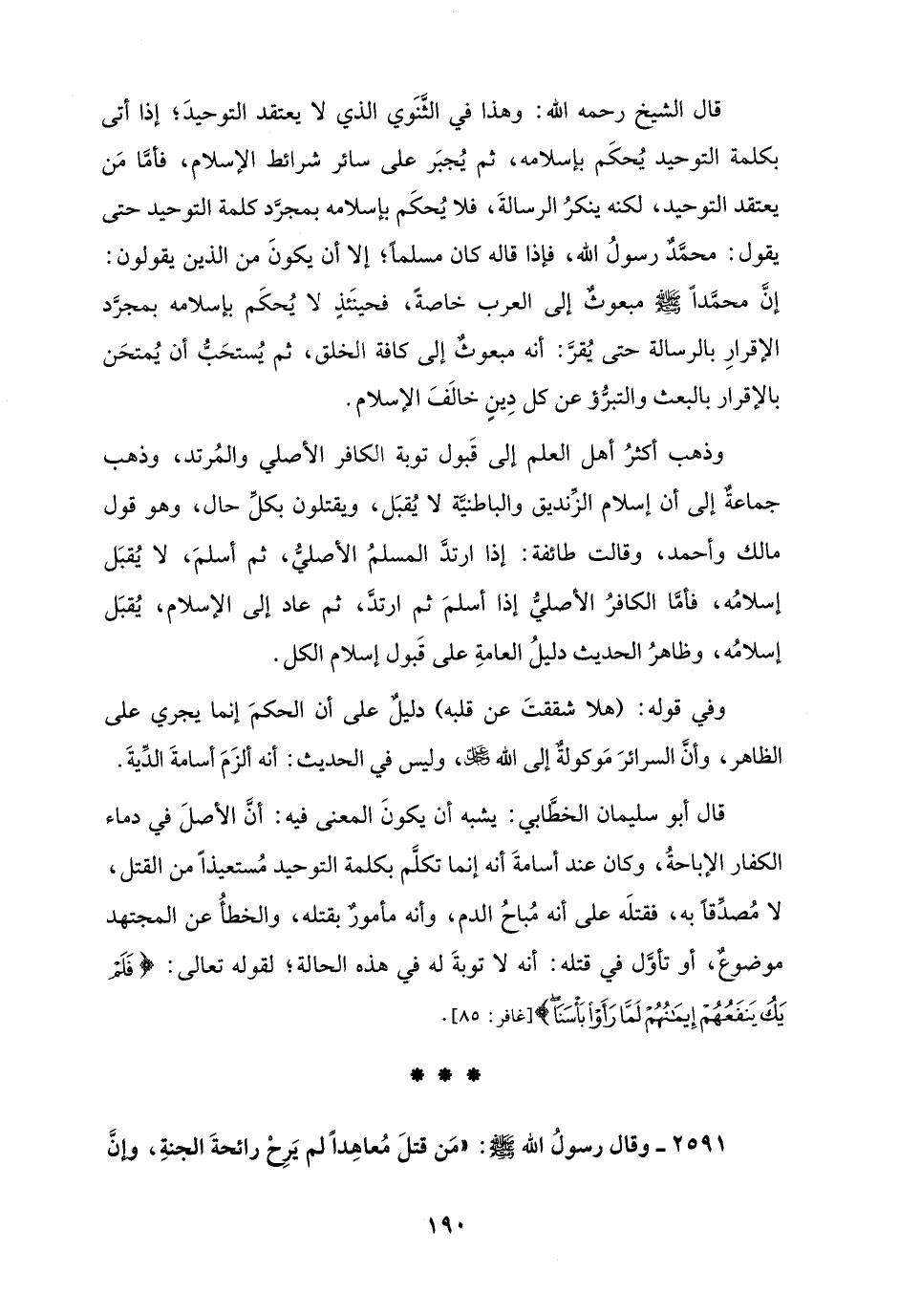 قال الشيخ رحمه الله: وهذا في الثَّنَوي الذي لا يعتقد التوحيدَ؛ إذا أتى بكلمة التوحيد يُحكَم بإسلامه، ثم يُجبَر على سائر شرائط الإسلام، فأمَّا مَن يعتقد التوحيد، لكنه ينكرُ الرسالةَ، فلا يُحكَم بإسلامه بمجرَّد كلمة التوحيد حتى يقول: محمَّدٌ رسولُ الله، فإذا قاله كان مسلمًا؛ إلا أن يكونَ من الذين يقولون: إنَّ محمَّدًا - صلى الله عليه وسلم - مبعوثٌ إلى العرب خاصةً، فحينَئذٍ لا يُحكَم بإسلامه بمجرَّد الإقرارِ بالرسالة حتى يُقرَّ: أنه مبعوثٌ إلى كافة الخلق، ثم يُستحَبُّ أن يُمتحَن بالإقرار بالبعث والتبرُّؤ عن كل دِينٍ خالَفَ الإسلام.
