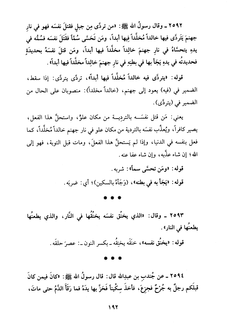 2592 - وقال رسولُ الله - صلى الله عليه وسلم -: "من تردَّى مِن جبلٍ فقتلَ نفسَه فهو في نارِ جهنمَ يترَدَّى فيها خالدًا مُخلَّدًا فِيها أبدًا، ومَن تَحَسَّى سُمًّا فقَتَلَ نفسَه فسمُه في يدهِ يتحسَّاهُ في نارِ جهنمَ خالِدًا مخلَّدًا فيها أبدًا، ومَن قتلَ نفسَهُ بحديدَةٍ فحديدتُه في يدهِ يَجَأ بها في بطنِهِ في نارِ جهنمَ خالِدًا مخلَّدًا فيها أبدًا".