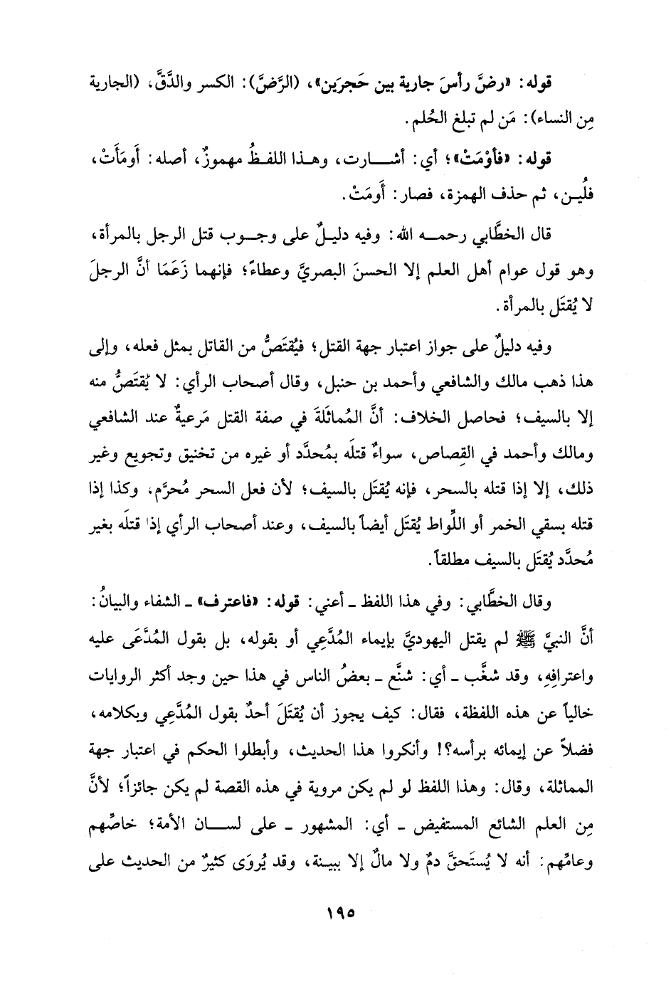قال الخطَّابي رحمه الله: وفيه دليلٌ على وجوب قتل الرجل بالمرأة، وهو قول عوام أهل العلم إلا الحسنَ البصريَّ وعطاءً؛ فإنهما زَعَمَا أنَّ الرجلَ لا يُقتَل بالمرأة.