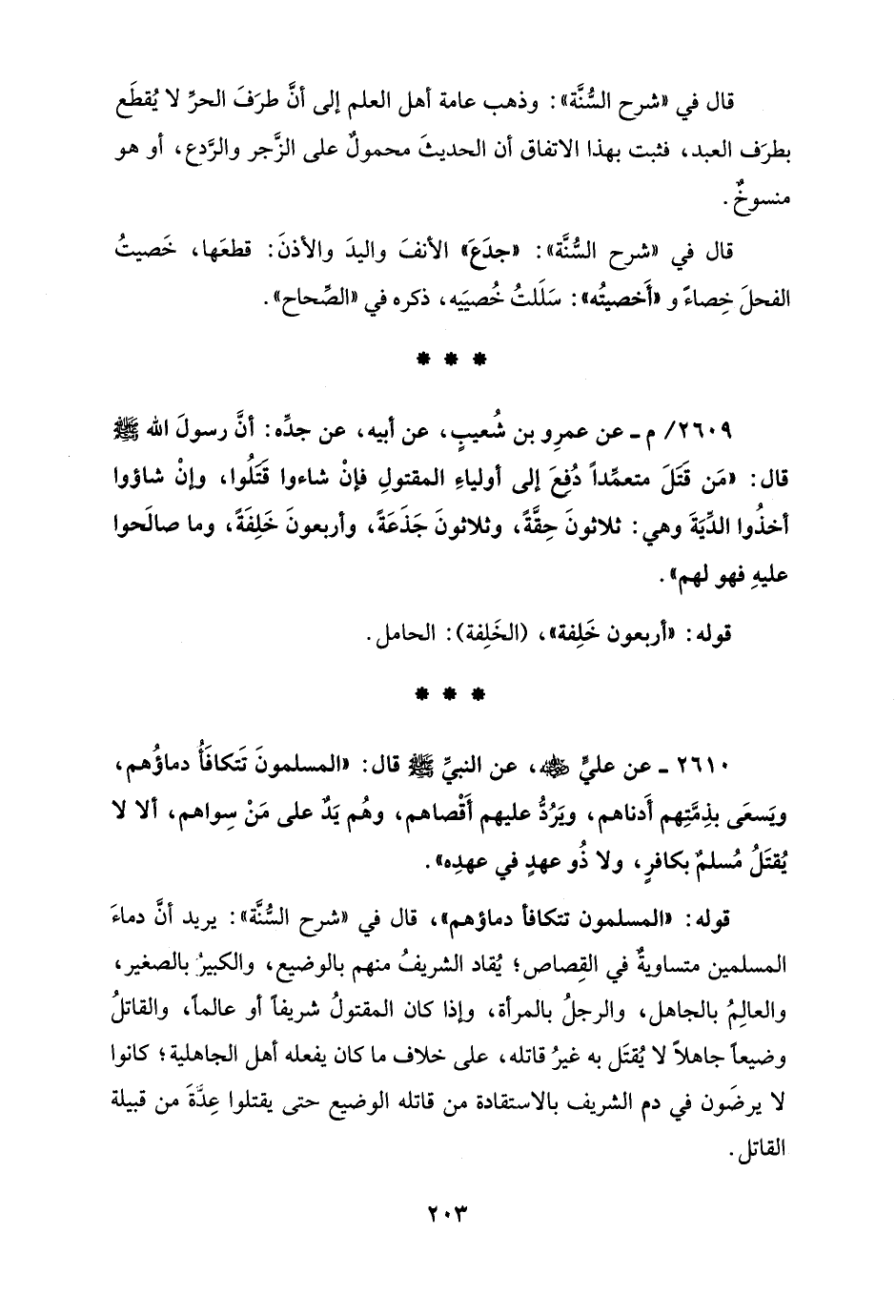 2610 - عن عليًّ - رضي الله عنه -، عن النبيِّ - صلى الله عليه وسلم - قال: "المسلمونَ تَتكافَأُ دماؤُهم، ويَسعَى بذِمَّتِهم أَدناهم، ويَرُدُّ عليهم أَقْصاهم، وهُم يَدٌ على مَنْ سِواهم، ألا لا يُقتَلُ مُسلمٌ بكافرٍ، ولا ذُو عهدٍ في عهدِه".