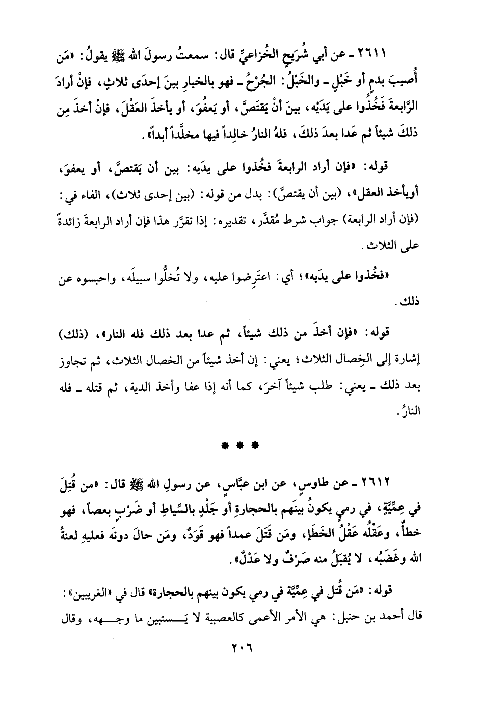 2612 - عن طاوسٍ، عن ابن عبَّاسٍ، عن رسولِ الله - صلى الله عليه وسلم - قال: "من قُتِلَ في عِمِّيَّةٍ، في رميٍ يكونُ بينَهم بالحجارةِ أو جَلْدٍ بالسِّياطِ أو ضَرْبٍ بعصًا، فهو خطأٌ، وعَقْلُه عَقْلُ الخَطَإ، ومَن قتلَ عمدًا فهو قَوَدٌ، ومَن حالَ دونَه فعليهِ لعنةُ الله وغضَبُه، لا يُقبَلُ منه صَرْفٌ ولا عَدْلٌ".
