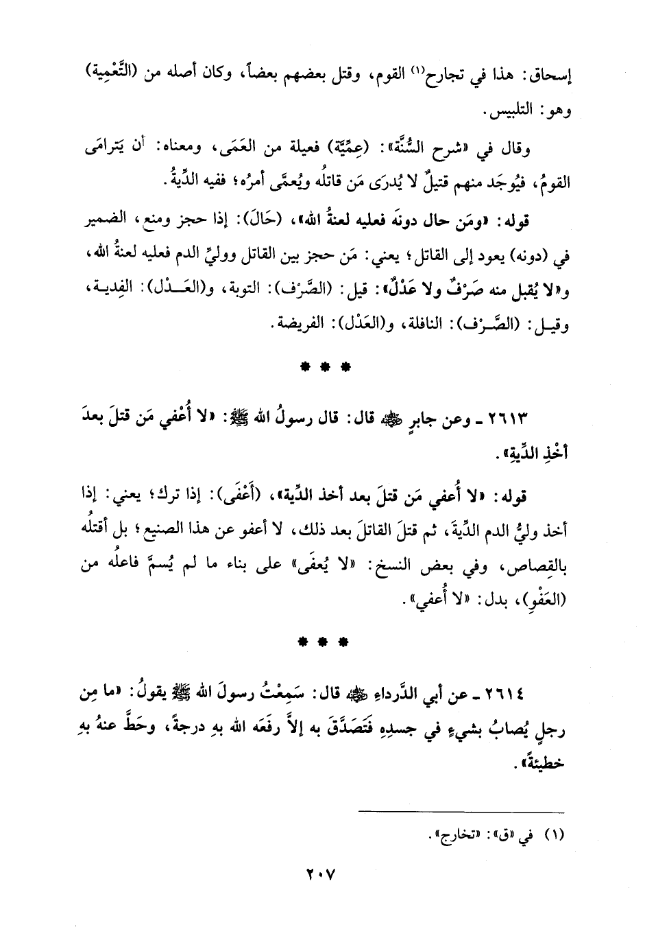 2613 - وعن جابرٍ - رضي الله عنه - قال: قال رسولُ الله - صلى الله عليه وسلم -: "لا أُعفي مَن قتلَ بعدَ أخْذِ الدَّيةِ".