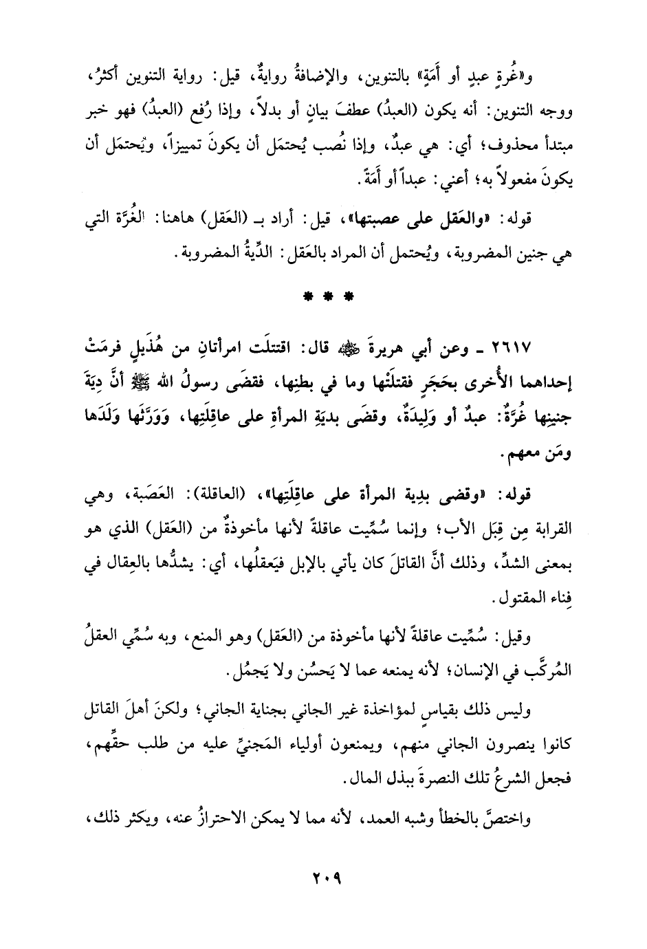 2617 - وعن أبي هريرةَ - رضي الله عنه - قال: اقتتلَت امرأتانِ من هُذَيلٍ فرمَتْ إحداهما الأخرى بحَجَرٍ فقتلَتْها وما في بطنِها، فقضَى رسولُ الله - صلى الله عليه وسلم - أنَّ دِيَةَ جنينِها غُرَّةٌ: عبد أو وَلِيدَةٌ، وقضَى بديَةِ المرأةِ على عاقِلَتِها، وَوَرَّثَها وَلَدَها ومَن معهم.