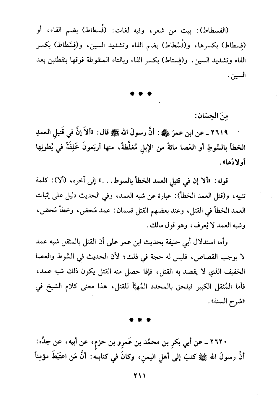 وأما استدلال أبي حنيفة بحديث ابن عمر على أن القتل بالمثقل شبه عمد لا يوجب القصاص، فليس له حجة في ذلك؛ لأن الحديث في السَّوط والعصا الخفيف الذي لا يقصد به القتل، فإذا حصل منه القتل يكون ذلك شبه عمد، فأما المُثقل الكبير فيلحق بالمحدد المُهيَّأ للقتل، هذا معنى كلام الشيخ في "شرح السنة".