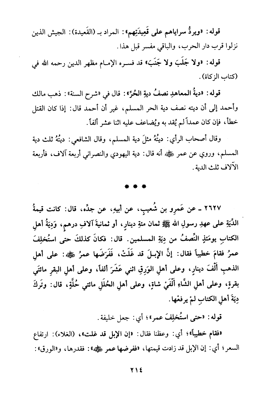 2627 - عن عَمرِو بن شُعيبٍ، عن أبيهِ، عن جدِّه، قال: كانت قيمةُ الدَّيَةِ على عهدِ رسولِ الله - صلى الله عليه وسلم - ثمان مئةِ دينارٍ، أو ثمانيةَ آلافِ درهم، وَدِيَةُ أهلِ الكتابِ يومَئذٍ النِّصفُ من دِيَةِ المسلمين. قال: فكانَ كذلكَ حتى استُخلِفَ عمرُ فقامَ خطيبًا فقال: إنَّ الإِبلَ قد غَلَتْ، فَفَرَضَها عمرُ - رضي الله عنه -: على أهلِ الذهبِ ألفَ دينارٍ، وعلى أهلِ الوَرِقِ اثني عَشَرَ ألفًا، وعلى أهلِ البقرِ مائتَي بقرةٍ، وعلى أهلِ الشَّاءِ أَلْفَيْ شاةٍ، وعلى أهلِ الحُلَلِ مائتي حُلَّةٍ، قال: وتَركَ دِيَةَ أهلِ الكتابِ لمْ يرفعْها.