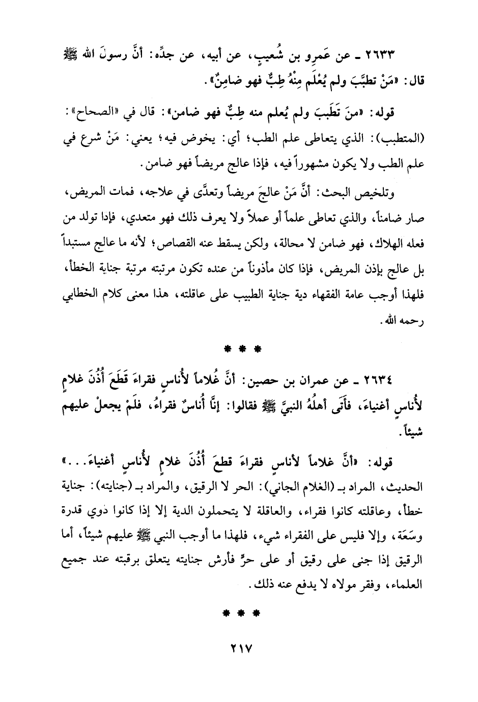 وتلخيص البحث: أنَّ مَنْ عالجَ مريضًا وتعدَّى في علاجه، فمات المريض، صار ضامنًا، والذي تعاطى علمًا أو عملًا ولا يعرف ذلك فهو متعدي، فإذا تولد من فعله الهلاك، فهو ضامن لا محالة، ولكن يسقط عنه القصاص؛ لأنه ما عالج مستبدًا بل عالج بإذن المريض، فإذا كان مأذونًا من عنده تكون مرتبته مرتبة جناية الخطأ، فلهذا أوجب عامة الفقهاء دية جناية الطبيب على عاقلته، هذا معنى كلام الخطابي رحمه الله.