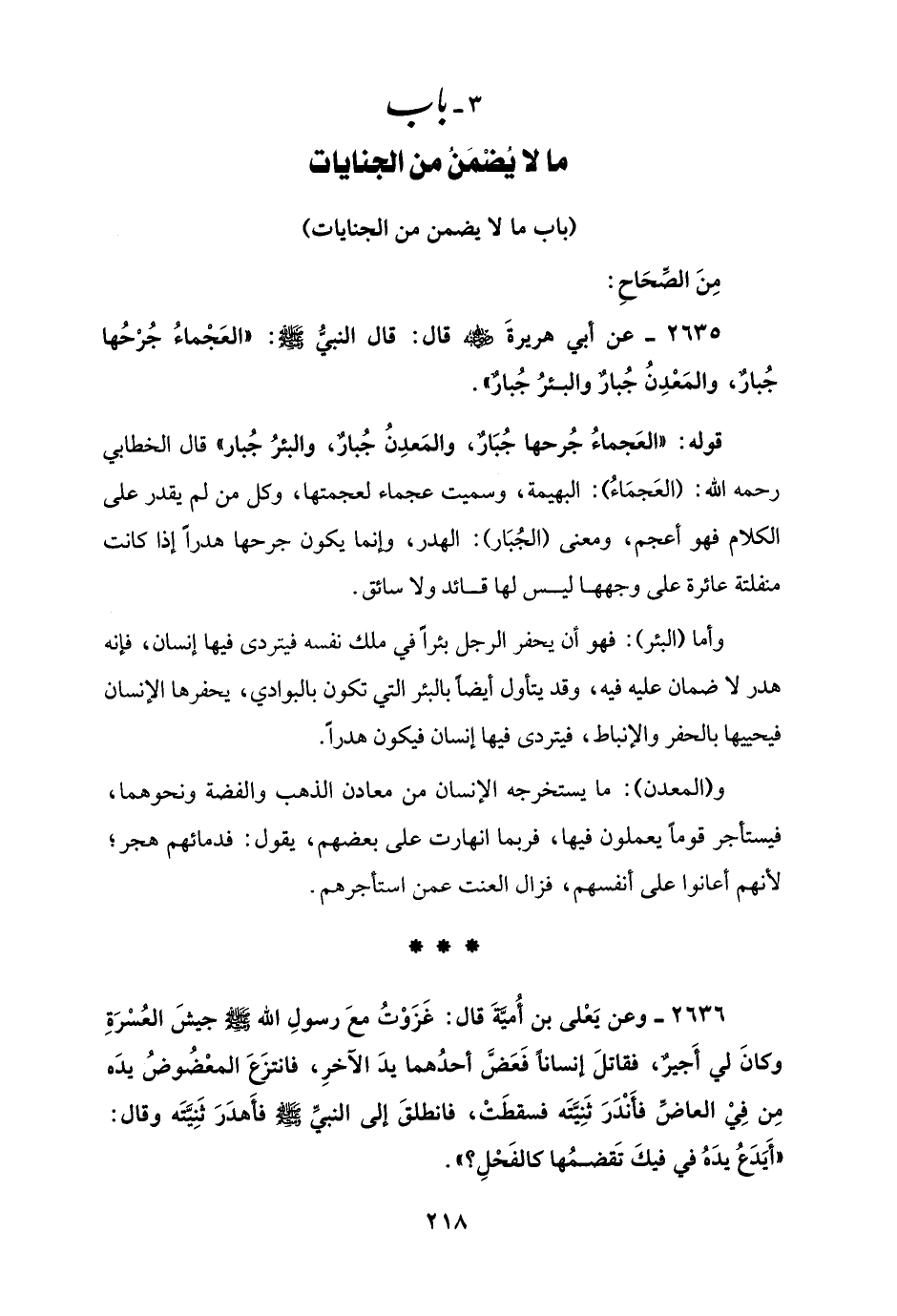 2635 - عن أبي هريرةَ - رضي الله عنه - قال: قال النبيُّ - صلى الله عليه وسلم -: "العَجْماءُ جُرْحُها جُبارٌ، والمَعدِنُ جُبارٌ والبئرُ جُبارٌ".