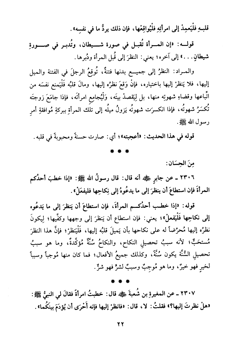 2307 - عن المغيرةِ بن شُعبةَ - رضي الله عنه - قال: خطبتُ امرأةً فقالَ لي النبيُّ - صلى الله عليه وسلم -: "هلْ نظرتَ إليها؟ " فقلتُ: لا، قال: "فانظرْ إليها فإنه أَحْرَى أن يُؤدَمَ بينَكُما".