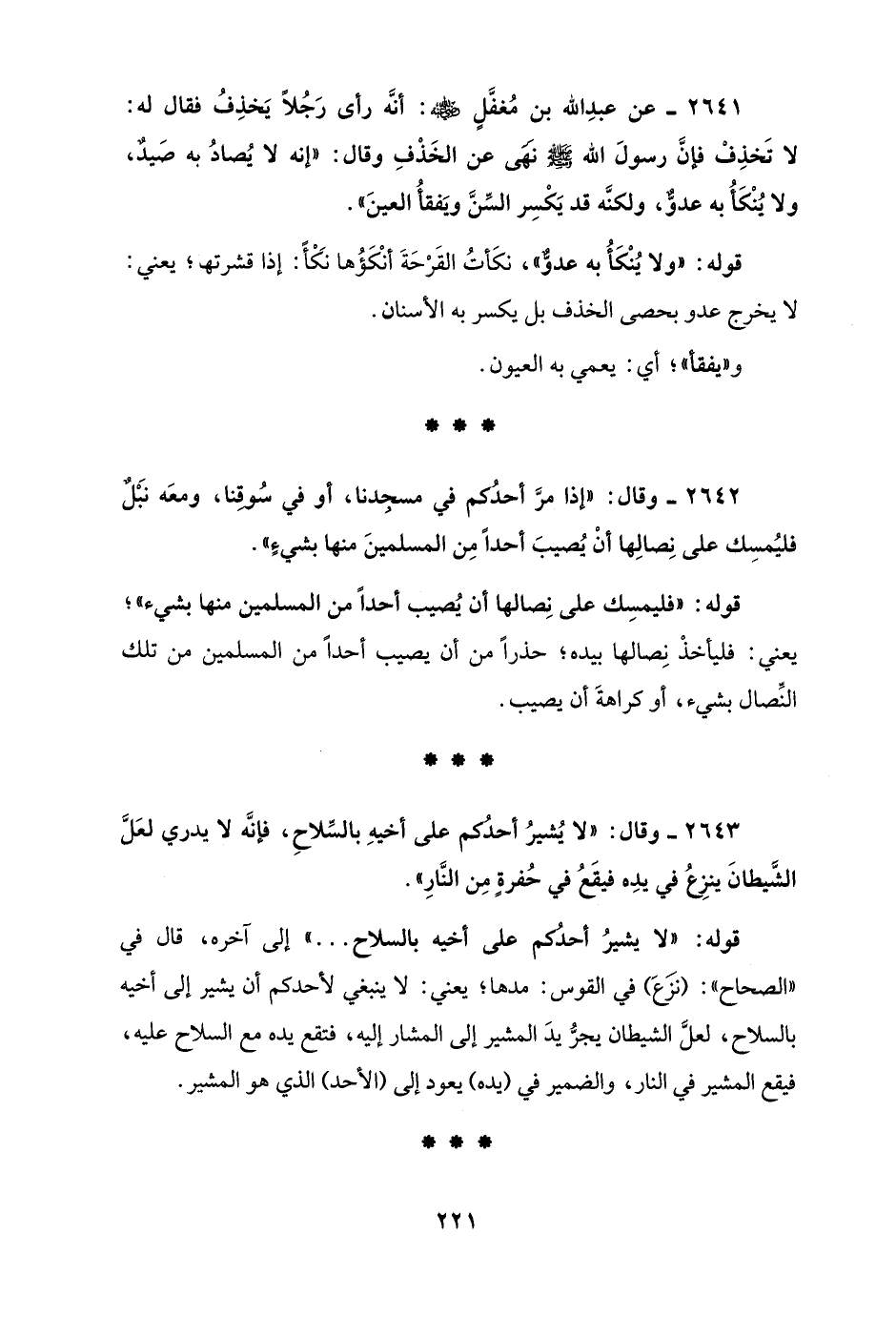 2641 - عن عبدِ الله بن مُغفَّلٍ - رضي الله عنه -: أنَّه رأى رَجُلاً يَخذِفُ فقال له: لا تَخذِفْ فإنَّ رسولَ الله - صلى الله عليه وسلم - نَهَى عن الخَذْفِ وقال: "إنه لا يُصادُ به صَيدٌ، ولا يُنْكَأُ به عدوٌّ، ولكنَّه قد يَكْسِر السِّنَّ ويَفقأُ العينَ".