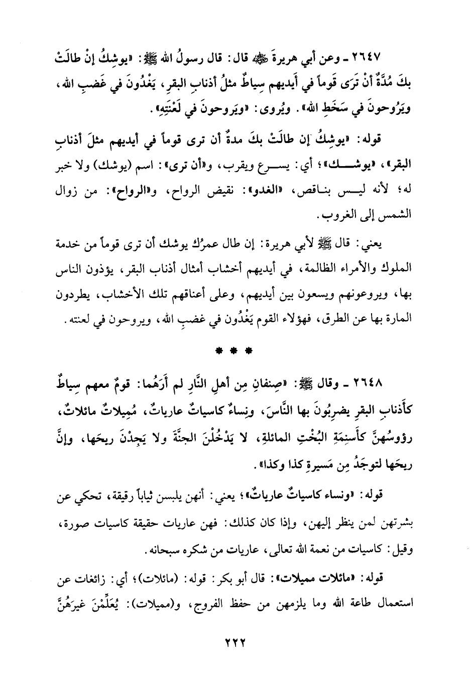 2647 - وعن أبي هريرةَ - رضي الله عنه - قال: قال رسولُ الله - صلى الله عليه وسلم -: "يوشِكُ إنْ طالَتْ بكَ مُدَّةٌ أنْ تَرَى قَومًا في أَيديهم سِياطٌ مثلُ أذنابِ البقرِ، يَغْدُونَ في غَضبِ الله، ويَرُوحونَ في سَخَطِ الله". ويُروى: "ويَروحونَ في لَعْنَتِهِ".
