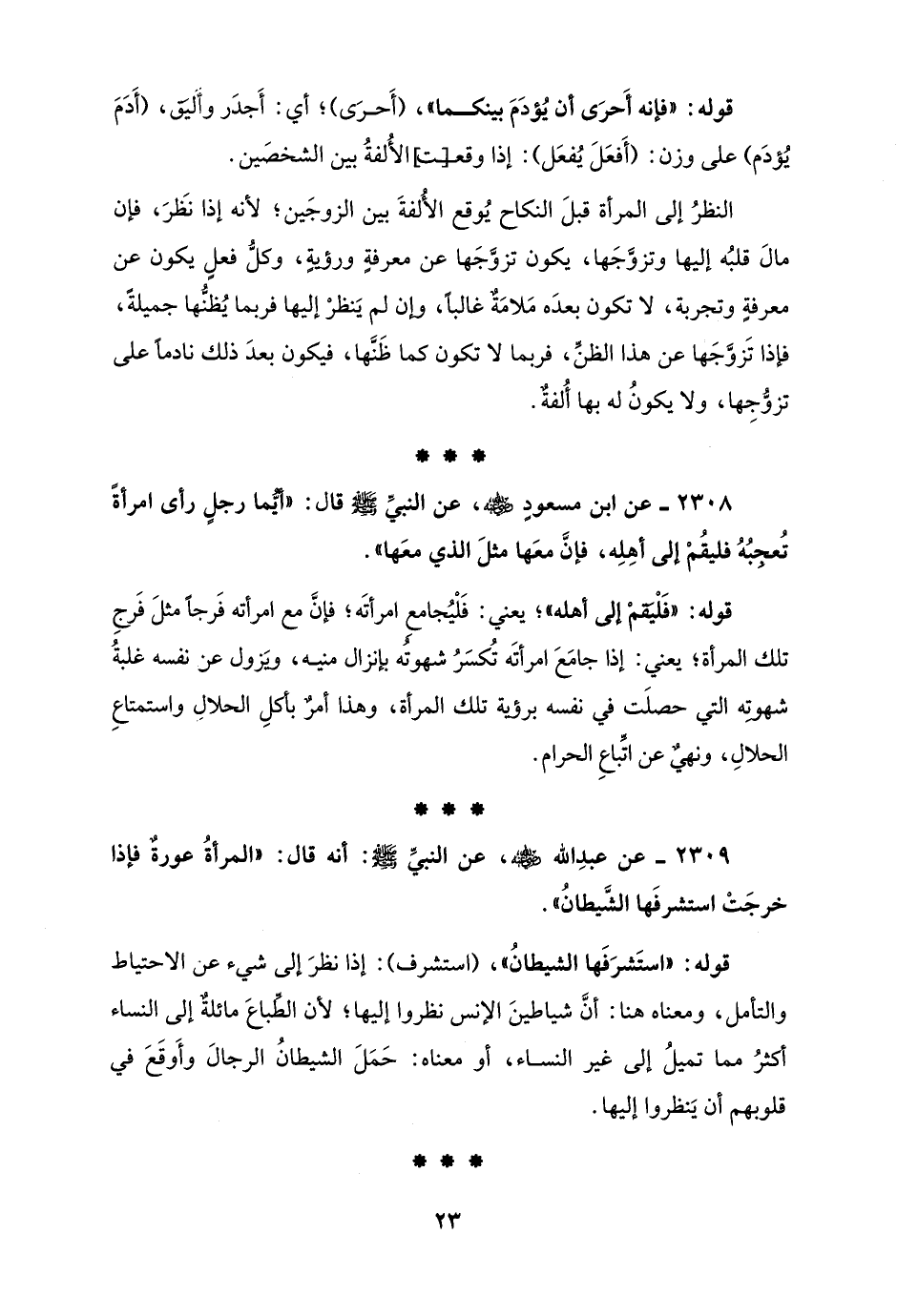 2308 - عن ابن مسعودٍ - رضي الله عنه -، عن النبيِّ - صلى الله عليه وسلم - قال: "أيُّما رجلٍ رأى امرأةً تُعجبُهُ فليقُمْ إلى أهِلِه، فإنَّ معَها مثلَ الذي معَها".