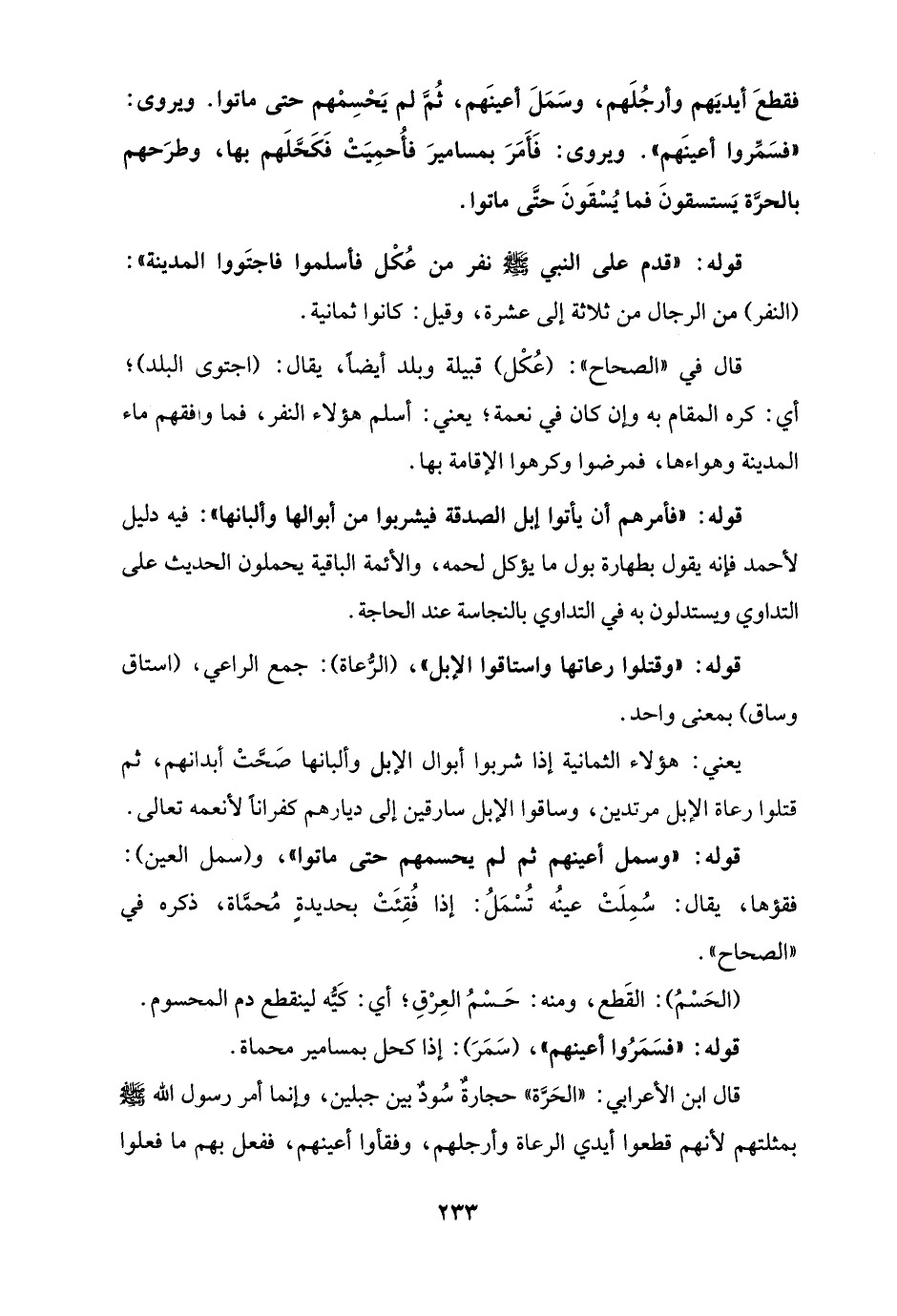 قال ابن الأعرابي: "الحَرَّة" حجارةٌ سُودٌ بين جبلين، وإنما أمر رسول الله - صلى الله عليه وسلم - بمثلتهم لأنهم قطعوا أيدي الرعاة وأرجلهم، وفقأوا أعينهم، ففعل بهم ما فعلوا