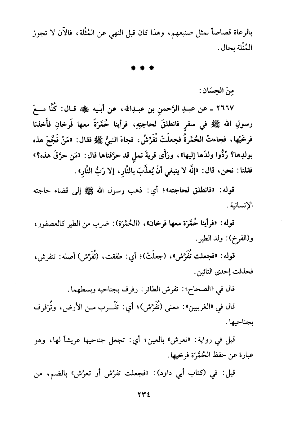 2667 - عن عبدِ الرَّحمنِ بن عبدِ الله، عن أبيه - رضي الله عنه - قال: كُنَّا معَ رسولِ الله - صلى الله عليه وسلم - في سفرٍ فانطلقَ لحاجتِهِ، فرأينا حُمَّرَةً معها فَرخانِ فأَخذنا فرخَيْها، فجاءتْ الحُمَّرةُ فجعلَتْ تُفَرِّشُ، فجاءَ النبيُّ - صلى الله عليه وسلم - فقال: "مَنْ فَجَّعَ هذه بولدِها؟ رُدُّوا ولدَها إليها"، ورَأَى قريةَ نملٍ قد حرَّقناها قال: "مَن حرَّقَ هذه؟ " فقلنا: نحن، قال: "إنَّه لا ينبغي أنْ يُعذِّبَ بالنَّارِ، إلا رَبُّ النَّارِ".