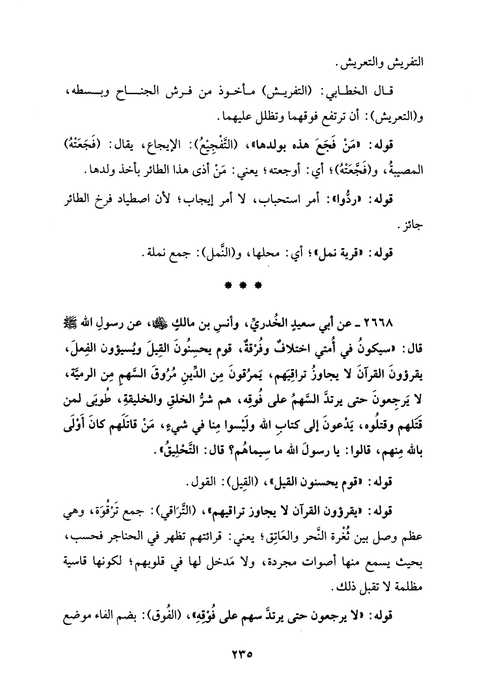 2668 - عن أبي سعيدٍ الخُدريِّ، وأنسِ بن مالكٍ - رضي الله عنهما -، عن رسولِ الله - صلى الله عليه وسلم - قال: "سيكونُ في أُمتي اختلافٌ وفُرْقةٌ، قوم يحسِنُونَ القِيلَ ويُسيؤون الفِعلَ، يقرؤونَ القرآنَ لا يجاوزُ تراقِيَهم، يَمرُقونَ مِن الدِّينِ مُرُوقَ السَّهمِ مِن الرميَّة، لا يَرجِعونَ حتى يرتدَّ السَّهمُ على فُوقِه، هم شرُّ الخلقِ والخليقةِ، طُوبَى لمن قَتَلهم وقتلُوه، يَدْعونَ إلى كتابِ الله ولَيْسوا مِنا في شيءٍ، مَنْ قاتَلَهم كانَ أَوْلَى بالله مِنهم، قالوا: يا رسولَ الله ما سِيماهُم؟ قال: التَّحْلِيقُ".