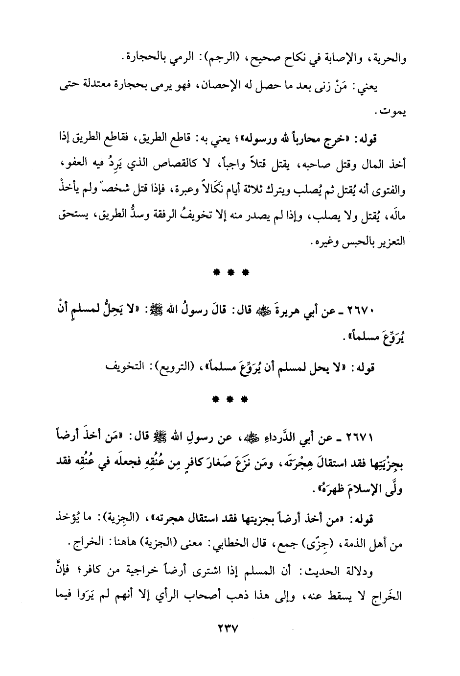 قوله: "خرج محاربًا لله ورسوله"؛ يعني به: قاطع الطريق، فقاطع الطريق إذا أخذ المال وقتل صاحبه، يقتل قتلاً واجبًا، لا كالقصاص الذي يَرِدُ فيه العفو، والفتوى أنه يُقتل ثم يُصلب ويترك ثلاثة أيام نَكَالاً وعبرة، فإذا قتل شخصًا ولم يأخذْ مالَه، يُقتل ولا يصلب، وإذا لم يصدر منه إلا تخويفُ الرفقة وسدُّ الطريق، يستحق التعزير بالحبس وغيره.
