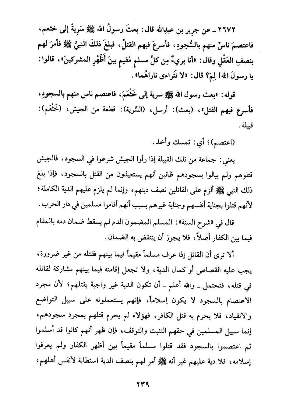 2672 - عن جرِير بن عبدِ الله قال: بعثَ رسولُ الله - صلى الله عليه وسلم - سَرِيةً إلى خثعم، فاعتصمَ ناسٌ منهم بالسُّجودِ، فأسرعَ فيهم القتلُ، فبلغَ ذلكَ النبيَّ - صلى الله عليه وسلم - فأمرَ لهم بنصفِ العَقْلِ وقال: "أنا بريءٌ مِن كلِّ مسلمٍ مُقيمٍ بينَ أَظْهُرِ المشركينَ"، قالوا: يا رسولَ الله! لِمَ؟ قال: "لا تَتَراءى ناراهُما".