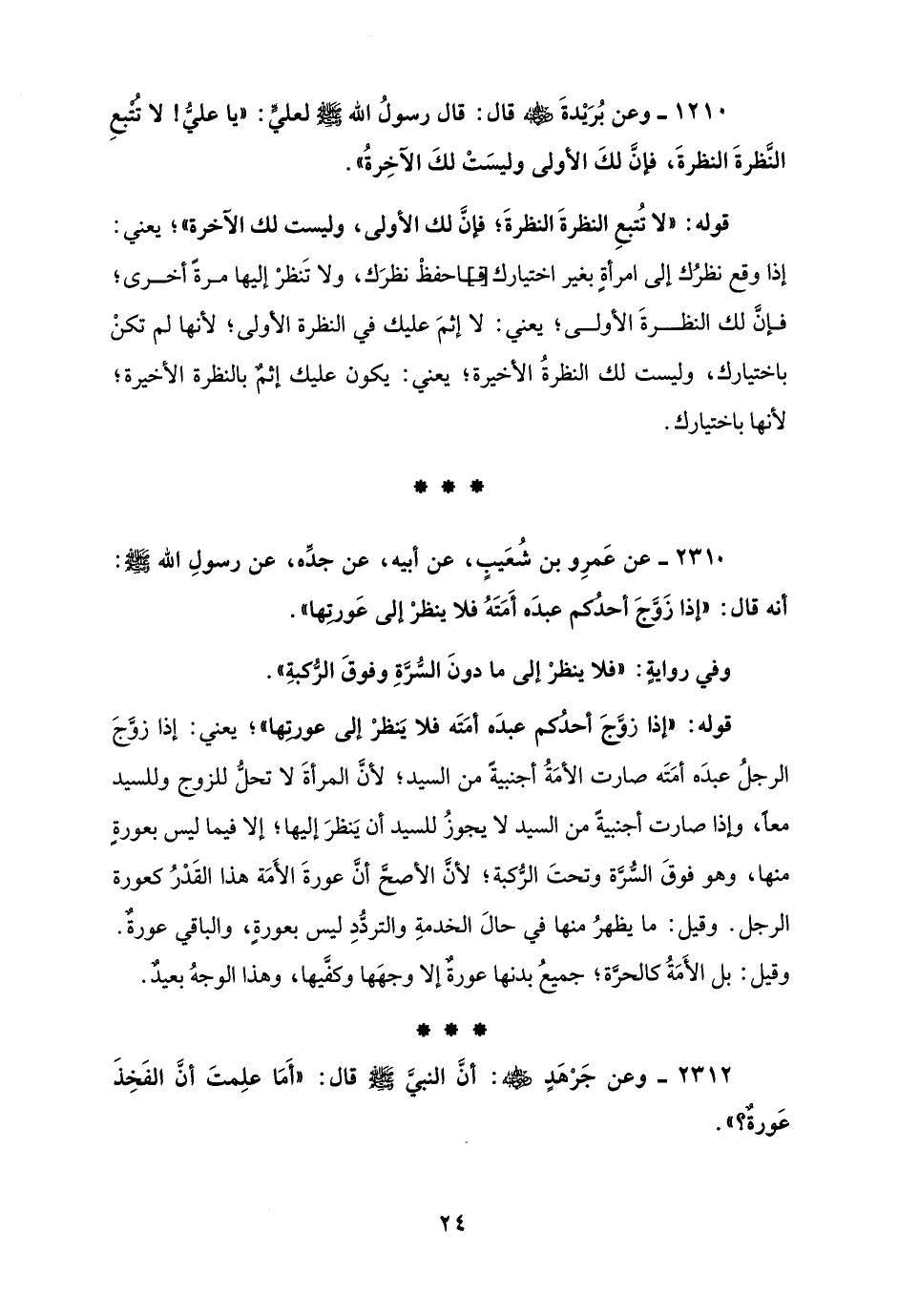 2310 - عن عَمرِو بن شُعَيبٍ، عن أبيه، عن جدِّه، عن رسولِ الله - صلى الله عليه وسلم -: أنه قال: "إذا زَوَّجَ أحدُكم عبدَه أَمَتَهُ فلا ينظرْ إلى عَورتِها".