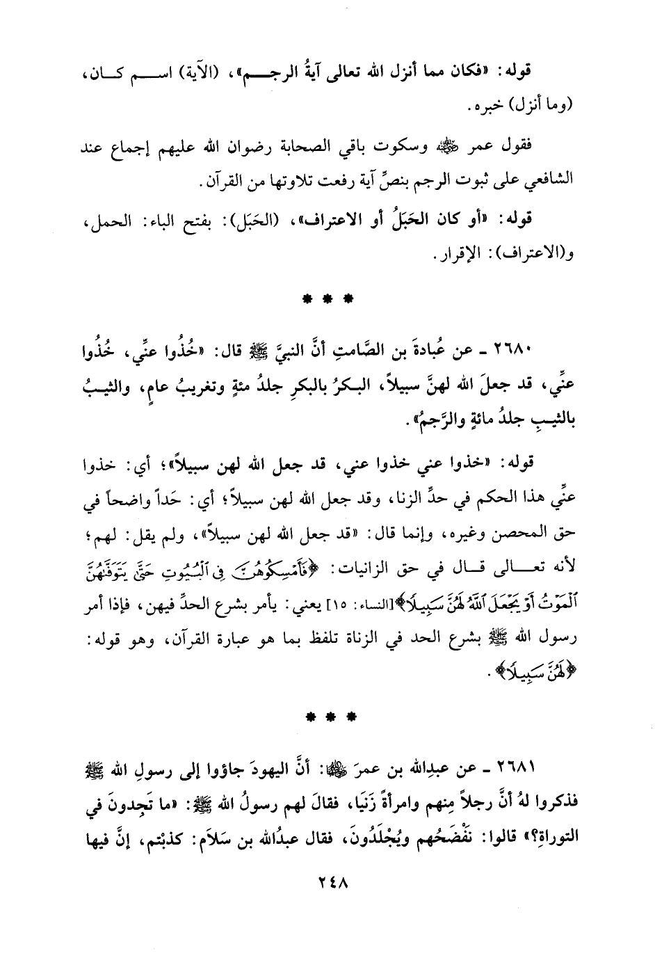 2681 - عن عبدِ الله بن عمرَ - رضي الله عنهما -: أنَّ اليهودَ جاؤوا إلى رسولِ الله - صلى الله عليه وسلم - فذكروا لهُ أنَّ رجلاً مِنهم وامرأةً زَنيَا، فقالَ لهم رسولُ الله - صلى الله عليه وسلم -: "ما تَجِدونَ في التوراةِ؟ " قالوا: نَفْضَحُهم ويُجْلَدُونَ، فقال عبدُ الله بن سَلاَم: كذبْتم، إنَّ فيها