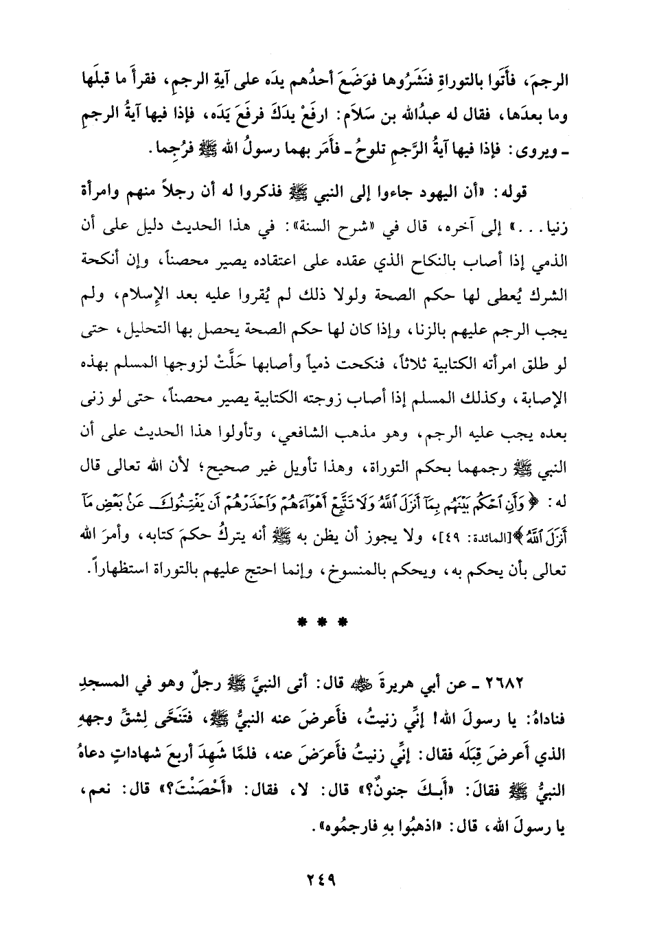 2682 - عن أبي هريرةَ - رضي الله عنه - قال: أتى النبيَّ - صلى الله عليه وسلم - رجلٌ وهو في المسجدِ فناداهُ: يا رسولَ الله! إنِّي زنيتُ، فأَعرضَ عنه النبيُّ - صلى الله عليه وسلم -، فتَنَحَّى لِشقِّ وجههِ الذي أَعرضَ قِبَلَه فقال: إنِّي زنيتُ فأَعرَضَ عنه، فلمَّا شَهِدَ أربعَ شهاداتٍ دعاهُ النبيُّ - صلى الله عليه وسلم - فقالَ: "أَبكَ جنونٌ؟ " قال: لا، فقال: "أَحْصَنْتَ؟ " قال: نعم، يا رسولَ الله، قال: "اذهبُوا بهِ فارجمُوه".