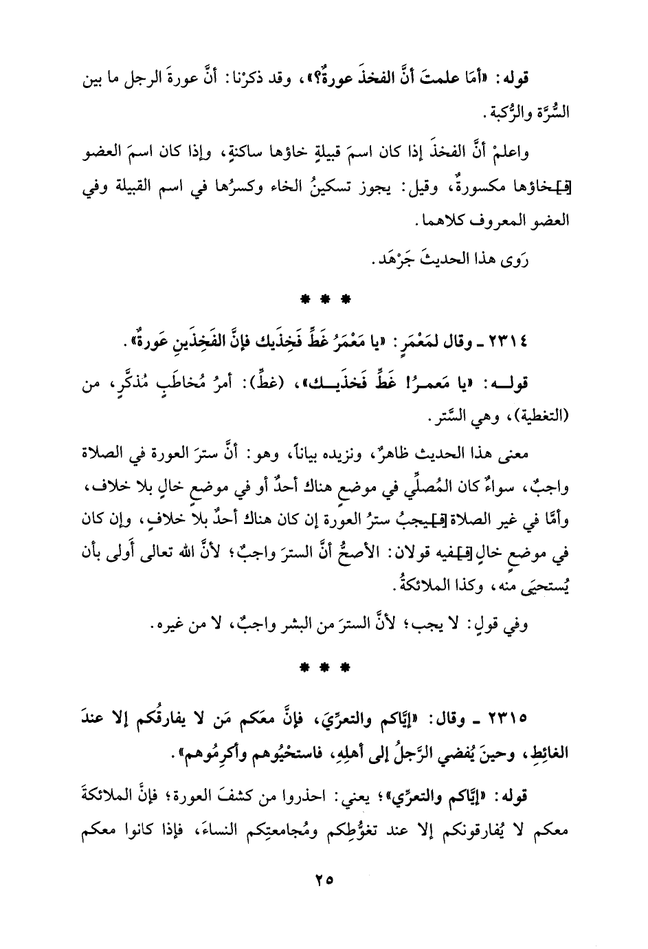 2314 - وقال لمَعْمَرٍ: "يا مَعْمَرُ غَطِّ فَخِذَيك فإن الفَخِذَينِ عَورةٌ".