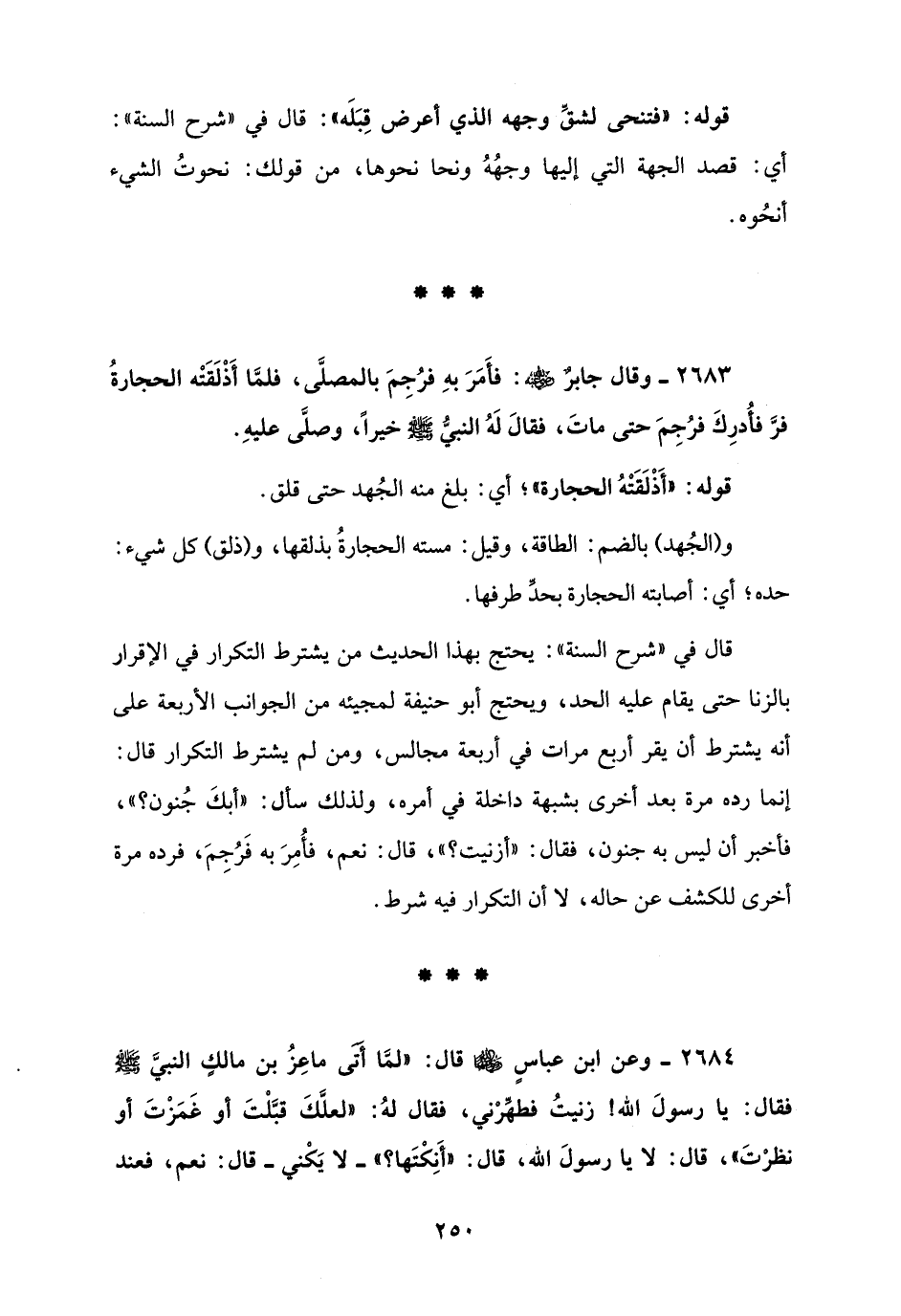 2684 - وعن ابن عباسٍ - رضي الله عنهما - قال: "لمَّا أَتَى ماعِزُ بن مالكٍ النبيَّ - صلى الله عليه وسلم - فقال: يا رسولَ الله! زنيتُ فطهِّرْني، فقال لهُ: "لعلَّكَ قبَّلْتَ أو غَمَزْتَ أو نظرْتَ"، قال: لا يا رسولَ الله، قال: "أَنِكْتَها؟ " - لا يَكْني - قال: نعم، فعند