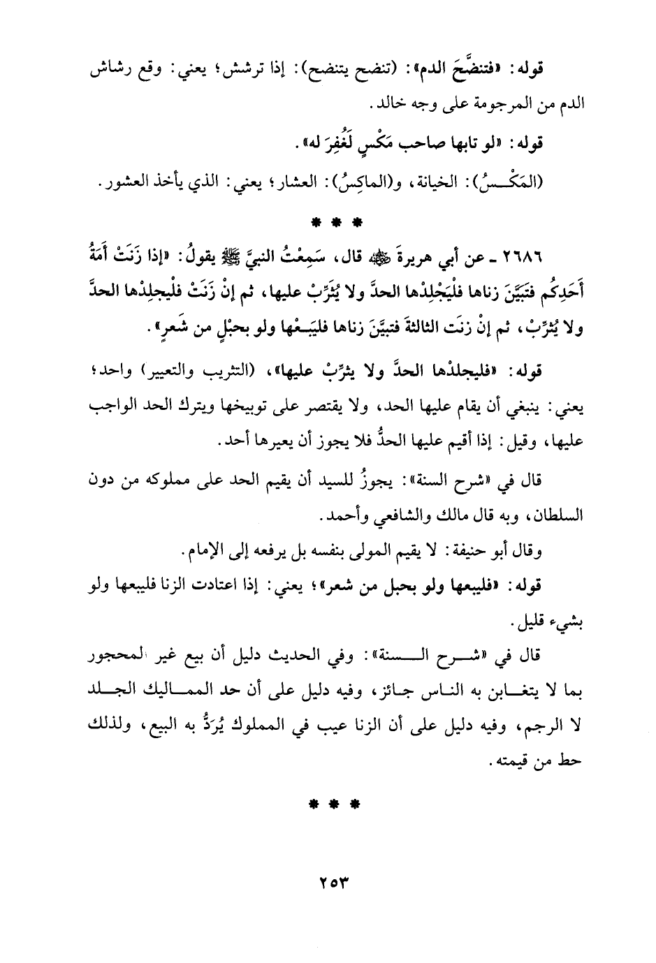 2686 - عن أبي هريرةَ - رضي الله عنه - قال، سَمِعْتُ النبيَّ - صلى الله عليه وسلم - يقولُ: "إذا زَنَتْ أَمَةُ أَحَدِكُم فتَبَيَّنَ زناها فلْيَجْلِدْها الحدَّ ولا يُثَرِّبْ عليها، ثم إنْ زَنَتْ فلْيجلِدْها الحدَّ ولا يُثرِّبْ، ثم إنْ زنَت الثالثةَ فتبيَّنَ زناها فليَبعْها ولو بحبْلٍ من شَعرٍ".