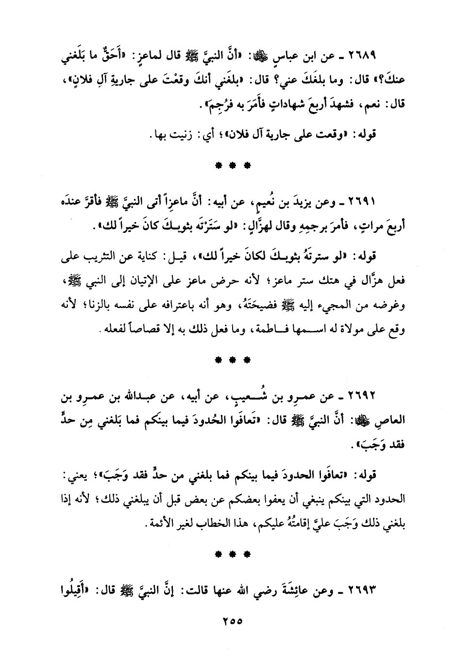 2689 - عن ابن عباسٍ - رضي الله عنهما -: "أنَّ النبيَّ - صلى الله عليه وسلم - قال لماعزٍ: "أَحَقٌّ ما بَلَغني عنكَ؟ " قال: وما بلغَكَ عني؟ قال: "بلغَني أنكَ وقعْتَ على جاريةِ آلِ فلانٍ"، قال: نعم، فشهدَ أربعَ شهاداتٍ فأَمَرَ به فرُجِمَ".