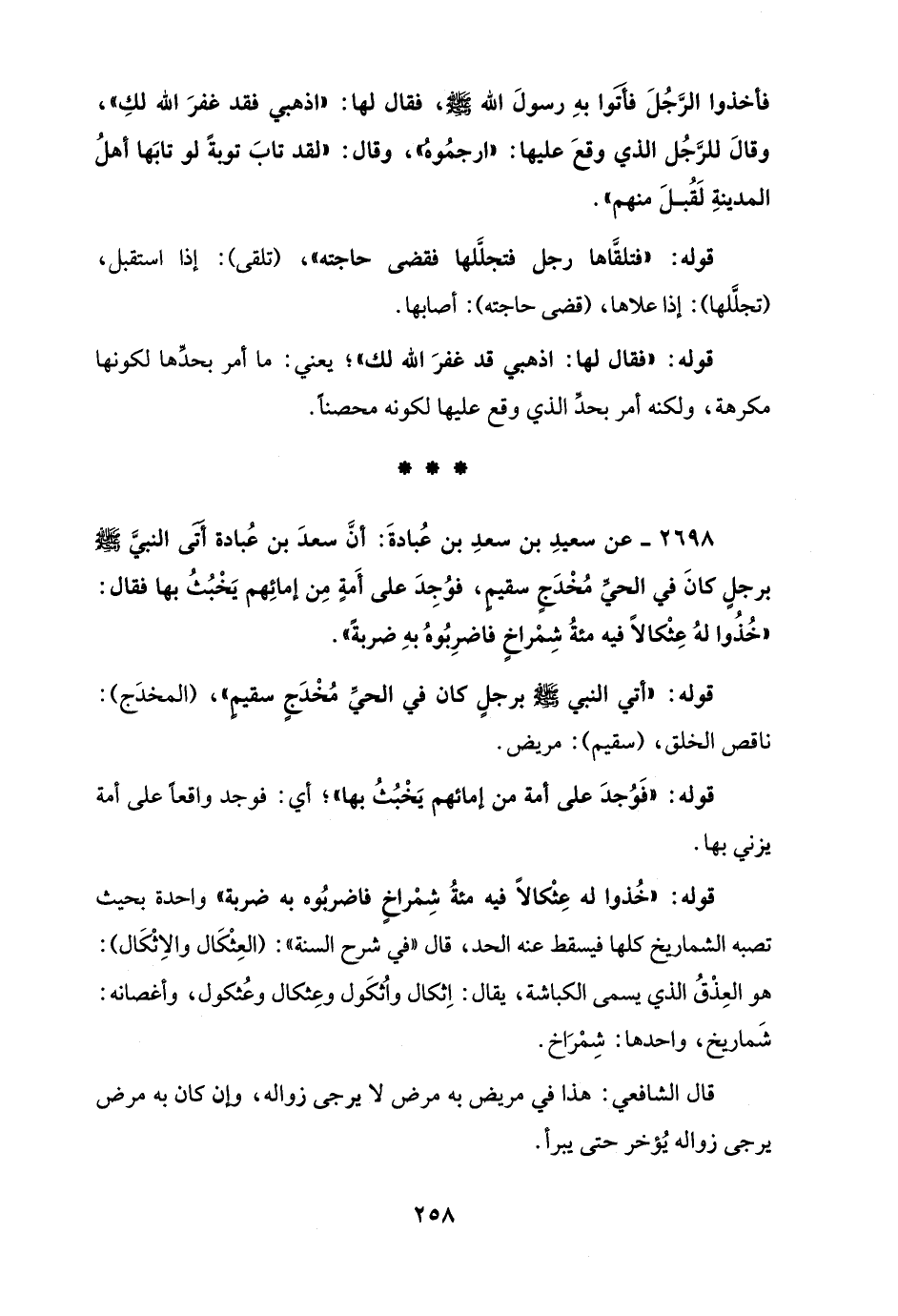 2698 - عن سعيدِ بن سعدِ بن عُبادةَ: أنَّ سعدَ بن عُبادة أَتَى النبيَّ - صلى الله عليه وسلم - برجلٍ كانَ في الحيِّ مُخْدَجٍ سقيمٍ، فوُجِدَ على أَمةٍ مِن إمائِهم يَخْبُثُ بها فقال: "خُذُوا لهُ عِثْكالاً فيه مئةُ شِمْراخٍ فاضرِبُوهُ بهِ ضربةً".