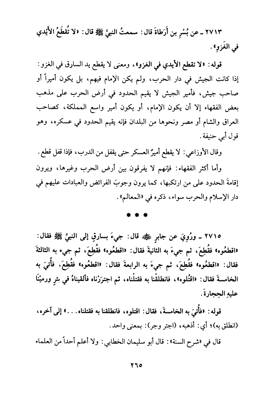 2715 - ورُوِيَ عن جابرٍ - رضي الله عنه - قال: جيءَ بسارقٍ إلى النبيِّ - صلى الله عليه وسلم - فقال: "اقطعُوه" فقُطِعَ، ثم جيءَ به الثانيةَ فقال: "اقطعُوه" فقُطِعَ، ثم جيء به الثالثةَ فقال: "اقطعُوه" فقُطِعَ، ثم جيءَ به الرابعةَ فقال: "اقطعُوه" فقُطِعَ، فأُتيَ به الخامسةَ فقال: "اقتُلوه"، فانطلقْنا به فقتلْناه، ثم اجترَرْناه فألقيناهُ في بئرٍ ورميْنَا عليهِ الحِجارةَ.