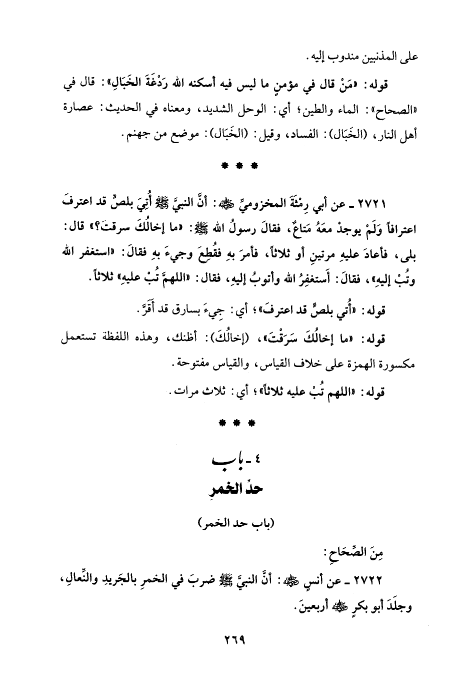 2721 - عن أبي رِمْثَةَ المخزوميِّ - رضي الله عنه -: أنَّ النبيَّ - صلى الله عليه وسلم - أُتِيَ بلصٍّ قد اعترفَ اعترافًا وَلَمْ يوجدْ معَهُ مَتاعٌ، فقالَ رسولُ الله - صلى الله عليه وسلم -: "ما إخالُكَ سرقتَ؟ " قال: بلى، فأعادَ عليهِ مرتينِ أو ثلاثًا، فأمرَ بهِ فقُطِعَ وجيءَ بهِ فقالَ: "استغفر الله وتُبْ إليهِ"، فقالَ: أَستغفِرُ الله وأتوبُ إليهِ، فقال: "اللهمَّ تُبْ عليهِ" ثلاثًا.