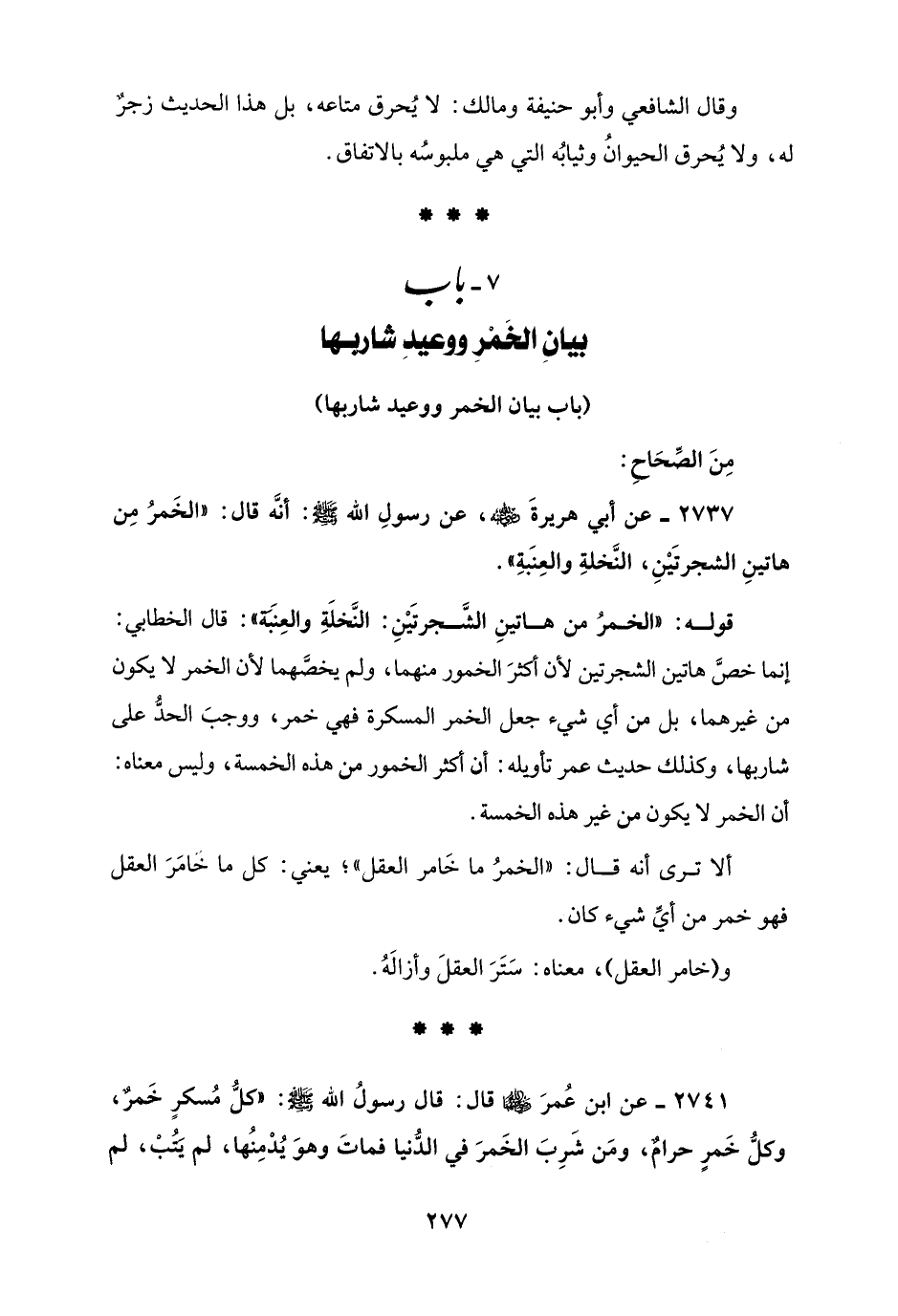 قوله: "الخمرُ من هاتينِ الشَّجرتَيْنِ: النَّخلَةِ والعِنَبَة": قال الخطابي: إنما خصَّ هاتين الشجرتين لأن أكثرَ الخمور منهما، ولم يخصَّهما لأن الخمر لا يكون من غيرهما، بل من أي شيء جعل الخمر المسكرة فهي خمر، ووجبَ الحدُّ على شاربها، وكذلك حديث عمر تأويله: أن أكثر الخمور من هذه الخمسة، وليس معناه: أن الخمر لا يكون من غير هذه الخمسة.