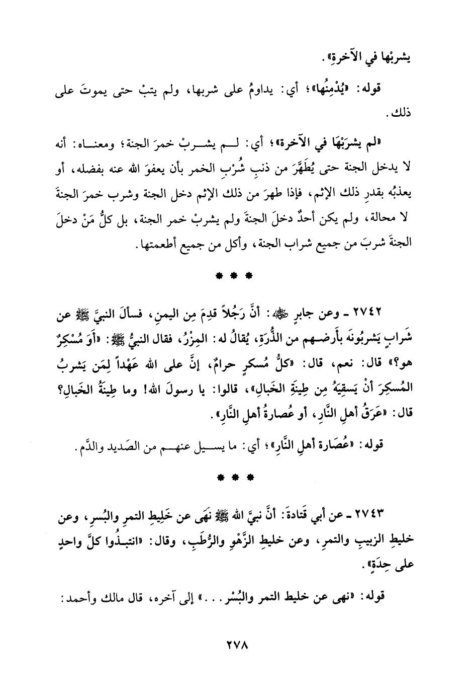2742 - وعن جابرٍ - رضي الله عنه -: أنَّ رَجُلاً قدِمَ مِن اليمنِ، فسألَ النبيَّ - صلى الله عليه وسلم - عن شَرابٍ يَشربُونَه بأَرضهم من الذُّرَةِ، يُقالُ له: المِزْرُ، فقال النبيُّ - صلى الله عليه وسلم -: "أَوَ مُسْكِرٌ هو؟ " قال: نعم، قال: "كلُّ مُسكرٍ حرامٌ، إنَّ على الله عهْدًا لِمَن يَشربُ المُسكِرَ أنْ يَسقِيَهُ مِن طِينَةِ الخَبالِ"، قالوا: يا رسولَ الله! وما طِينَةُ الخَبالِ؟ قال: "عَرَقُ أهلِ النَّارِ، أو عُصارةُ أهلِ النَّارِ".