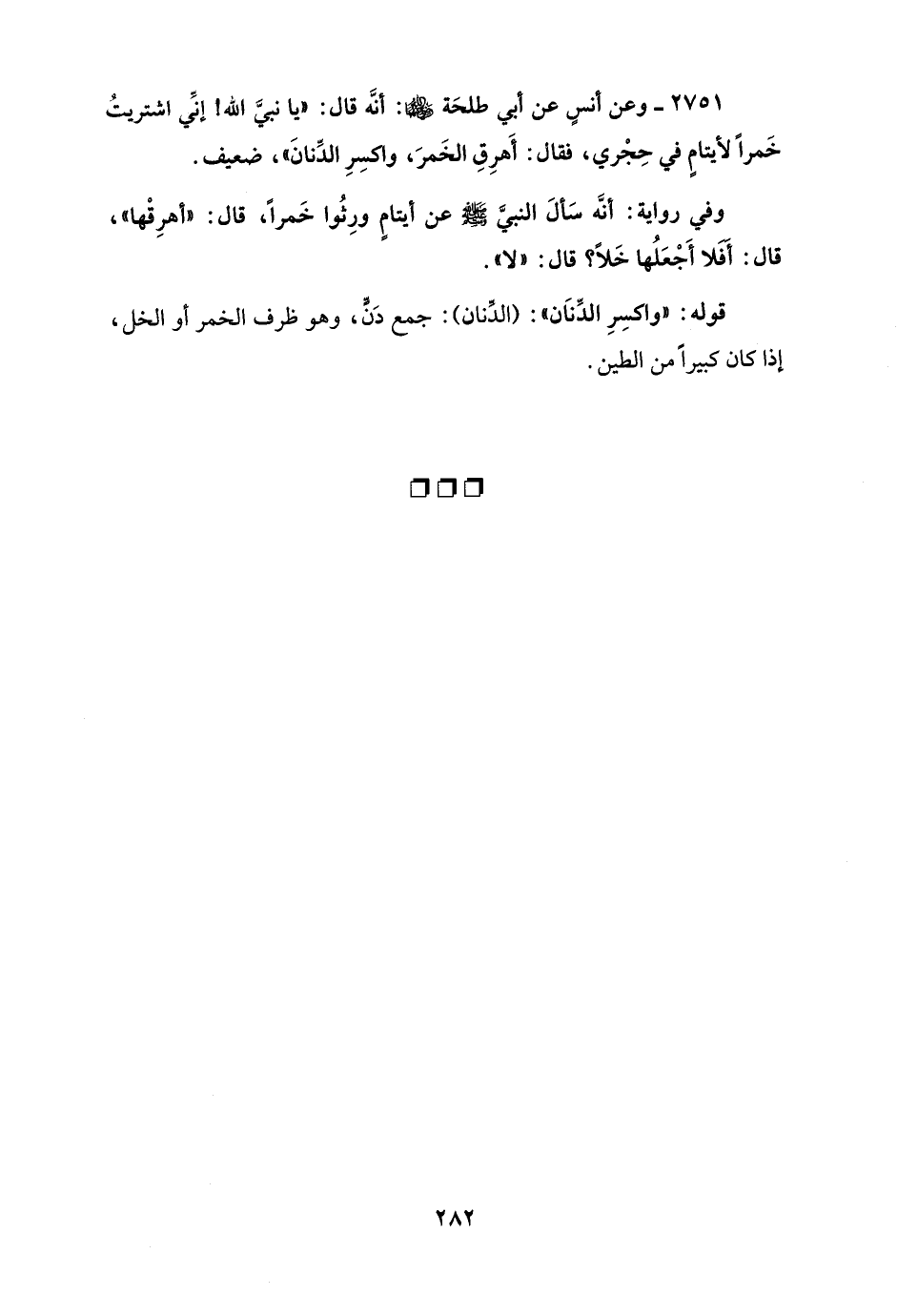 2751 - وعن أنسٍ عن أبي طلحَة - رضي الله عنهما -: أنَّه قال: "يا نبيَّ الله! إنِّي اشتريتُ خَمرًا لأيتامٍ في حِجْري، فقال: أَهرِقِ الخَمرَ، واكسِرِ الدِّنانَ"، ضعيف.