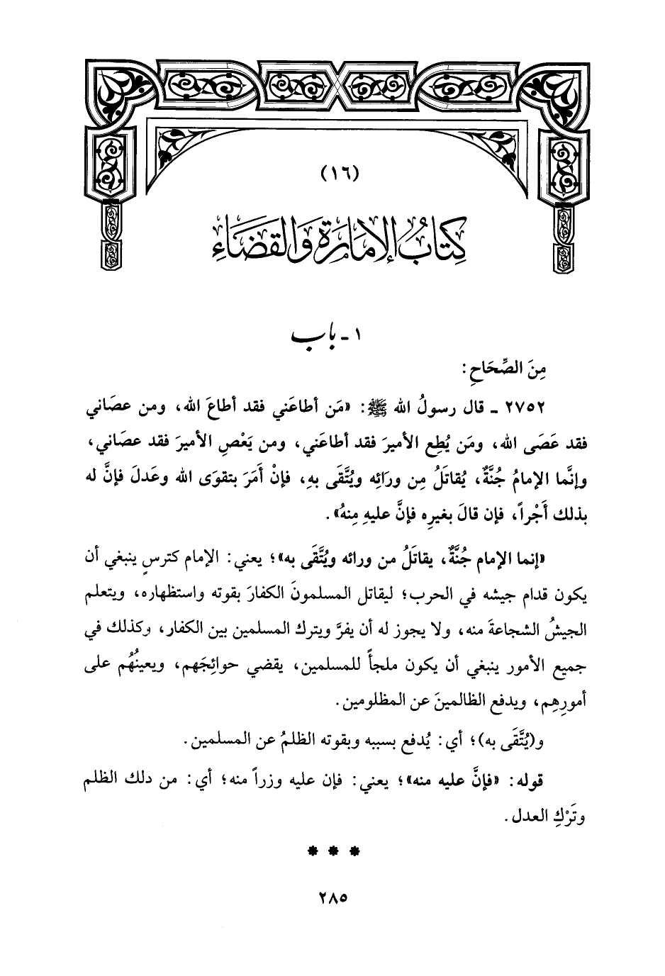 2752 - قال رسولُ الله - صلى الله عليه وسلم -: "مَن أطاعَني فقد أطاعَ الله، ومن عصَاني فقد عَصَى الله، ومَن يُطِع الأميرَ فقد أطاعَني، ومن يَعْصِ الأميرَ فقد عصَاني، وإنَّما الإمامُ جُنَّةٌ، يُقاتَلُ مِن ورَائِه ويُتَّقَى بهِ، فإنْ أَمَرَ بتقوَى الله وعَدلَ فإنَّ له بذلك أَجْرًا، فإن قالَ بغيرِه فإنَّ عليهِ مِنهُ".