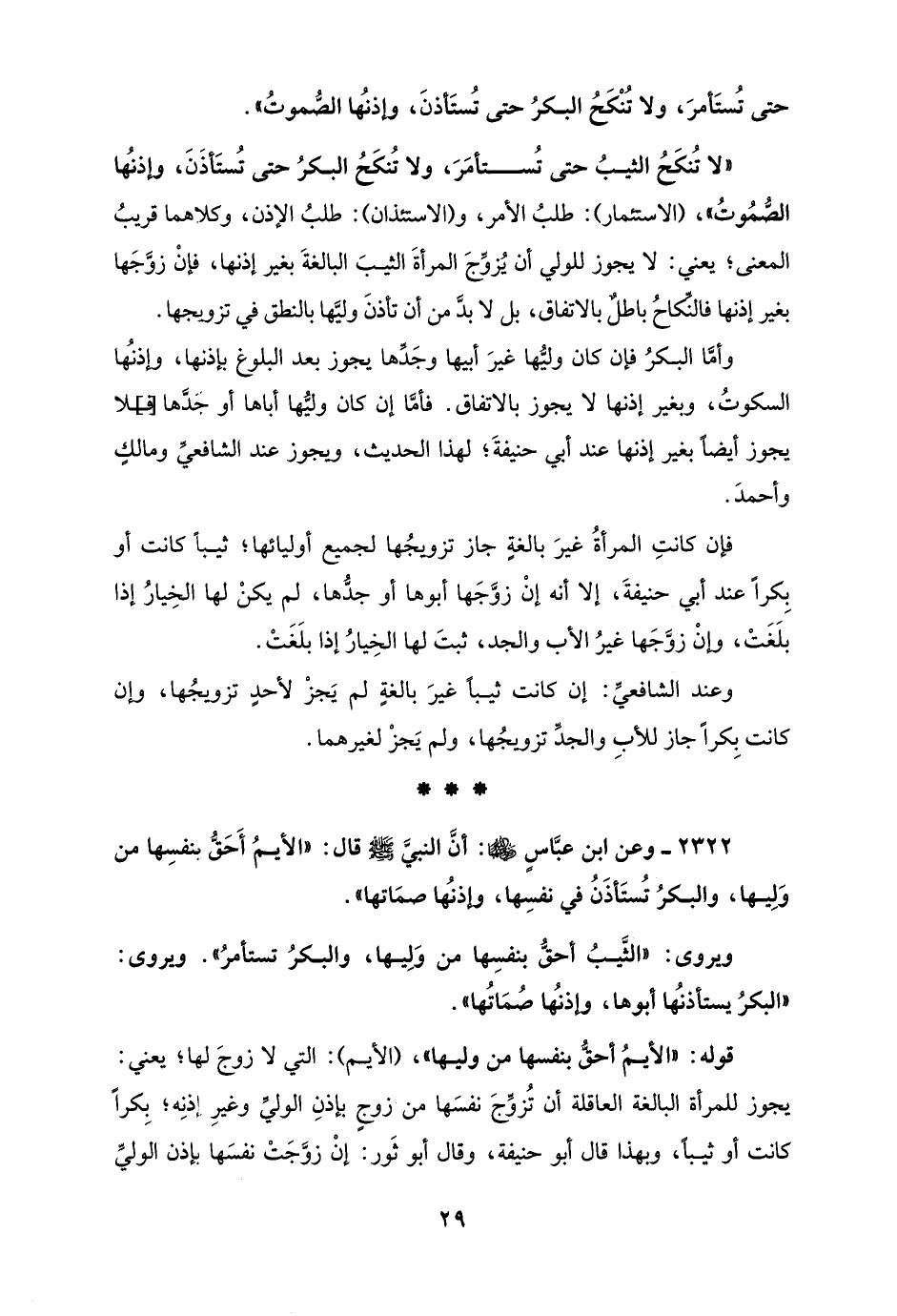 "لا تُنكَحُ الثيبُ حتى تُستأمَرَ، ولا تُنكَحُ البكرُ حتى تُستَأذَنَ، وإذنُها الصُّمُوتُ"، (الاستئمار): طلبُ الأمر، و (الاستئذان): طلبُ الإذن، وكلاهما قريبُ المعنى؛ يعني: لا يجوز للولي أن يُزوِّجَ المرأةَ الثيبَ البالغةَ بغير إذنها، فإنْ زوَّجَها بغير إذنها فالنكاحُ باطلٌ بالاتفاق، بل لا بدَّ من أن تأذنَ وليَّها بالنطق في تزويجها.
