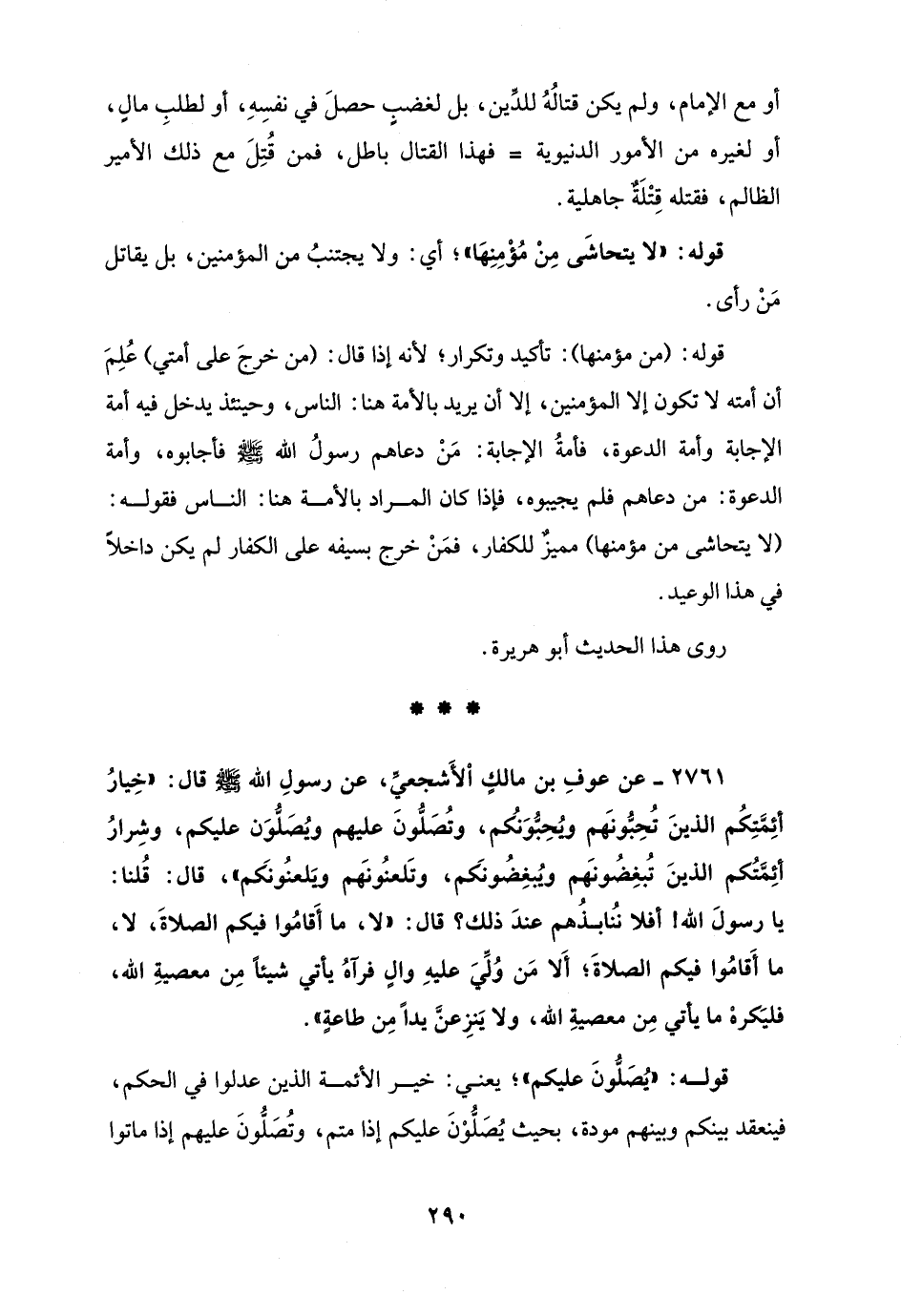 2761 - عن عوفِ بن مالكٍ اْلأَشجعيِّ، عن رسولِ الله - صلى الله عليه وسلم - قال: "خِيارُ أئِمَّتِكُم الذينَ تُحِبُّونَهم ويُحِبُّوَنُكم، وتُصَلُّونَ عليهم ويُصَلُّوَن عليكم، وشِرارُ أئِمَّتُكم الذينَ تُبغِضُونَهم ويُبغِضُونَكم، وتَلعنُونَهم ويَلعنُونَكم"، قال: قُلنا: يا رسولَ الله! أفلا نُنابذُهم عندَ ذلك؟ قال: "لا، ما أَقامُوا فيكم الصلاةَ، لا، ما أَقامُوا فيكم الصلاةَ؛ أَلا مَن وُلِّيَ عليهِ والٍ فرآهُ يأتي شيئًا مِن معصيةِ الله، فليَكرهْ ما يأتي مِن معصيةِ الله، ولا يَنزِعنَّ يدًا مِن طاعةٍ".
