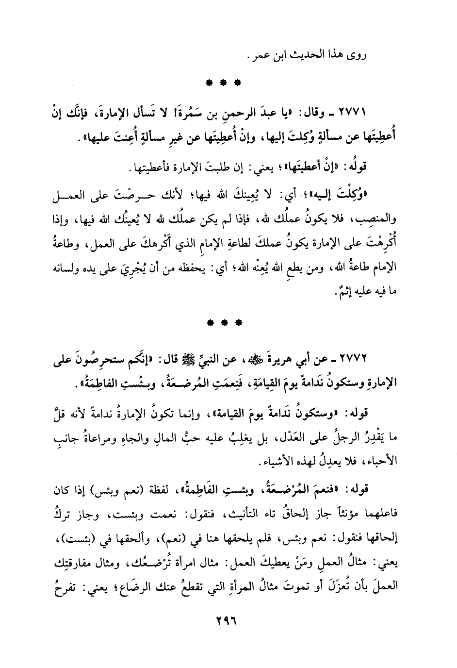 2772 - عن أبي هريرةَ - رضي الله عنه -، عن النبيِّ - صلى الله عليه وسلم - قال: "إنَّكم ستحرِصُونَ على الإمارةِ وستكونُ نَدامةً يومَ القِيامَةِ، فَنِعمَتِ المُرضعَةُ، وبئْستِ الفاطِمَةُ".