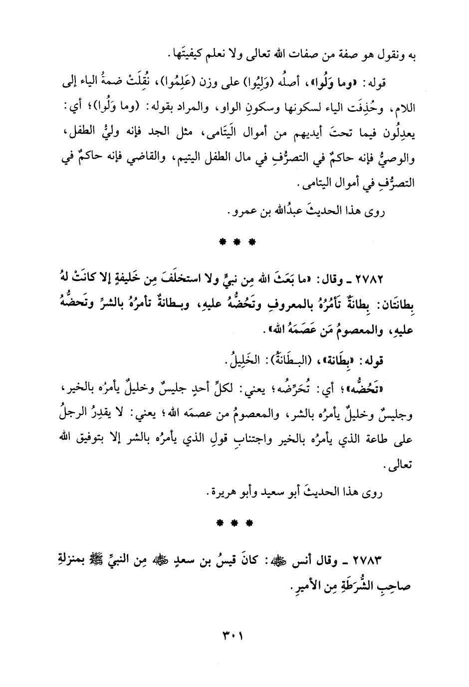 2782 - وقال: "ما بَعَثَ الله مِن نبيٍّ ولا استخلَفَ مِن خَليفةٍ إلا كانَتْ لهُ بِطانتَان: بِطانَةٌ تَأمُرُهُ بالمعروفِ وتَحُضُّهُ عليهِ، وبطانةٌ تأمرُهُ بالشرِّ وتَحضُّهُ عليهِ، والمعصومُ مَن عَصَمَهُ الله".