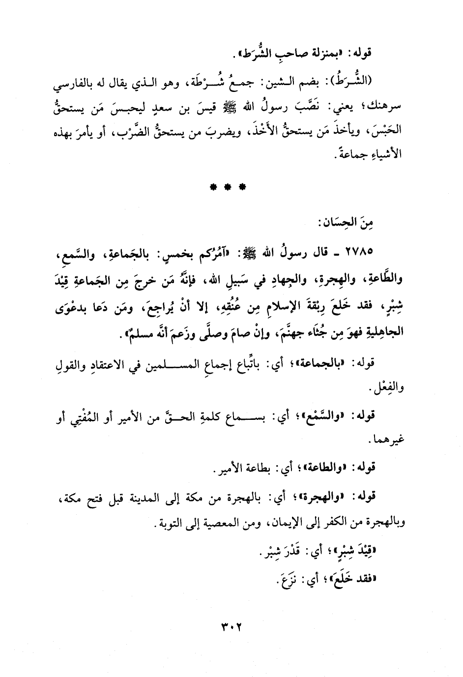 2785 - قال رسولُ الله - صلى الله عليه وسلم -: "آمُرُكم بخمسٍ: بالجَماعةِ، والسَّمعِ، والطَّاعةِ، والهِجرةِ، والجِهادِ في سَبيلِ الله، فإنَّهُ مَن خرجَ مِن الجَماعةِ قِيْدَ شِبْرٍ، فقد خَلعَ رِبْقةَ الإسلامِ مِن عُنُقِهِ، إلا أنْ يُراجِعَ، ومَن دَعا بدعْوَى الجاهِليةِ فهوَ مِن جُثَاء جهنَّمَ، وإنْ صامَ وصلَّى وزَعمَ أنَّه مسلمٌ".