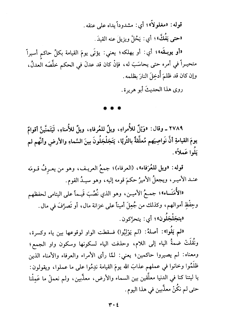 2789 - وقال: "وَيْلٌ للأُمراءِ، ويلٌ للعُرفاءِ، ويلٌ للأُمناءِ، لَيَتَمنَّينَّ أقوامٌ يومَ القيامةِ أنَّ نوَاصِيَهم مُعلَّقةٌ بالثُريَّا، يَتَجَلْجَلُونَ بينَ السَّماءِ والأرضِ وأنَّهم لم يَلُوا عَملاً".